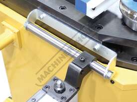 The table comes with an 203.2mm three jaw chuck with 63.5mm thru hole that allows for longer pieces of tubing than the table length. Chuck can handle up to 114.3mm OD. The minimum OD is 6.35mm. The table has a linear indicator strip so the operator can set up accurate distances between bends. Mechanical stops can be positioned for the start of each bend. Using the mechanical stops is very beneficial for repeatability on bigger production runs. Another nice feature of the table is that the positioning carriage rolls on a precision V block rail and rides the rail using V-block bearings. These bearings are placed on eccentric shafts, which allows for tolerance adjustment allowing the most accurate results.