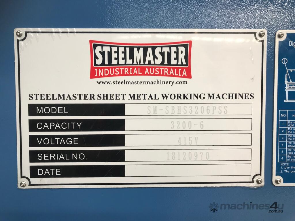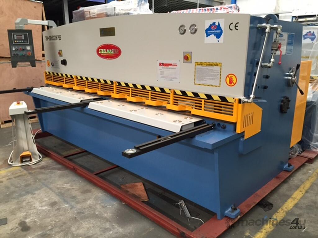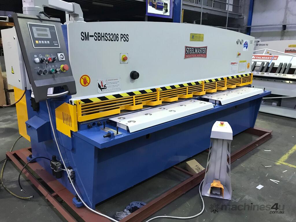 SM-SBHS3206. Hydraulic Guillotine. Steelmaster 3200mm x 6.5mm with Power Ballscrew Back Gauge. Quality Reversable Blades, 250mm Side Throat, Quick Action Gap Setting, Squaring Arm & Supports.