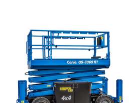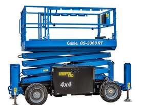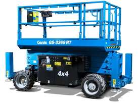 The Genie GS3369 RT rough terrain scissor lift is built for extra-rugged performance and can traverse through uneven, rough terrain environments.