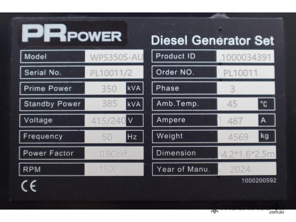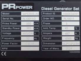 Prime 350kVA, 280kW 3PH 240/415V 50Hz housed in a weatherproof lockable sound attenuated enclosure made of high grade steel protected by powder coat paint finish.