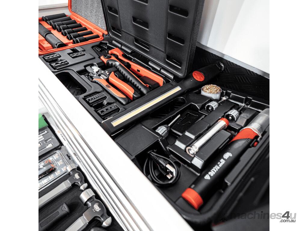 A Full-length Barrel Hinge and Gas struts give a smooth and precise lifting action to uncover the 5 drawers mounted on UHD ball bearing slides.