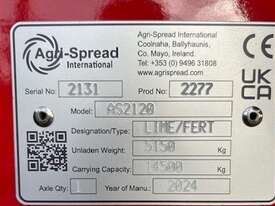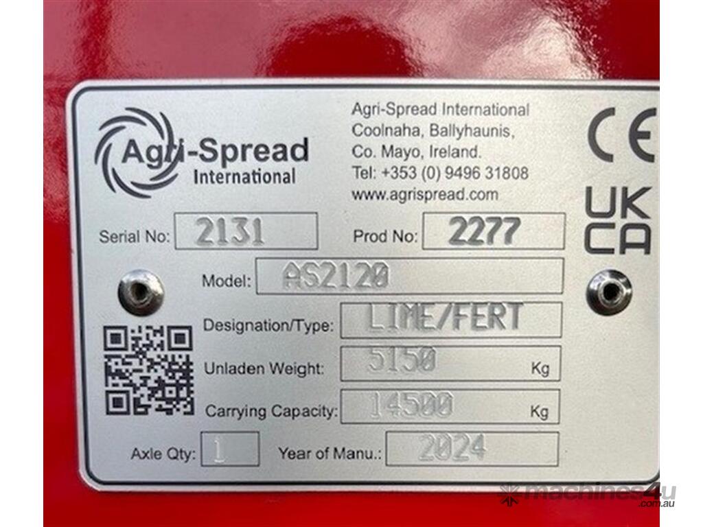 36m 2024 AGRISPREAD AS2120 SPREADER. New/unused, 36m spread width, 2 or 3m axle, load scales, headland auto shut off, Isobus, Roll Tarp. Serial No. 2131, Model AS2120, 14.5T capacity. Contact Grady Sinclair on for more information. Located Moree, NSW. Available at MRE Auctions.