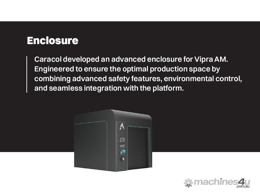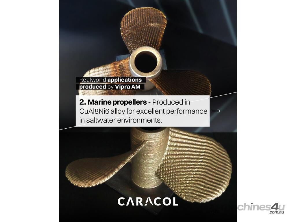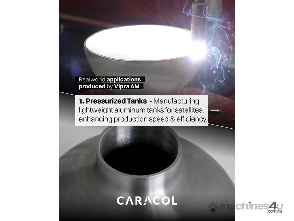 Caracol equipped Vipra AM with a 9-axis industrial robotic arm and positioner kinematics to enhance flexibility for 3D printing complex geometries, enabling complex building strategies like non-planar slicing, multi-angle welding, and printing on parts with overhangs. The print volume can be expanded by placing the robot on a rail.