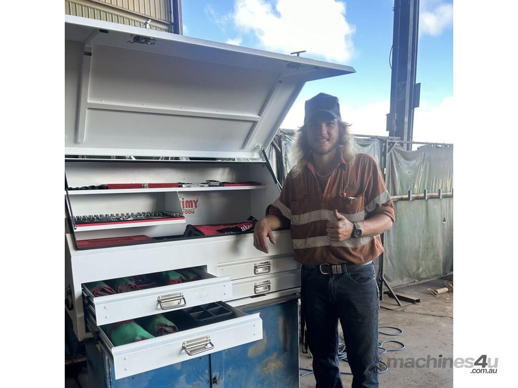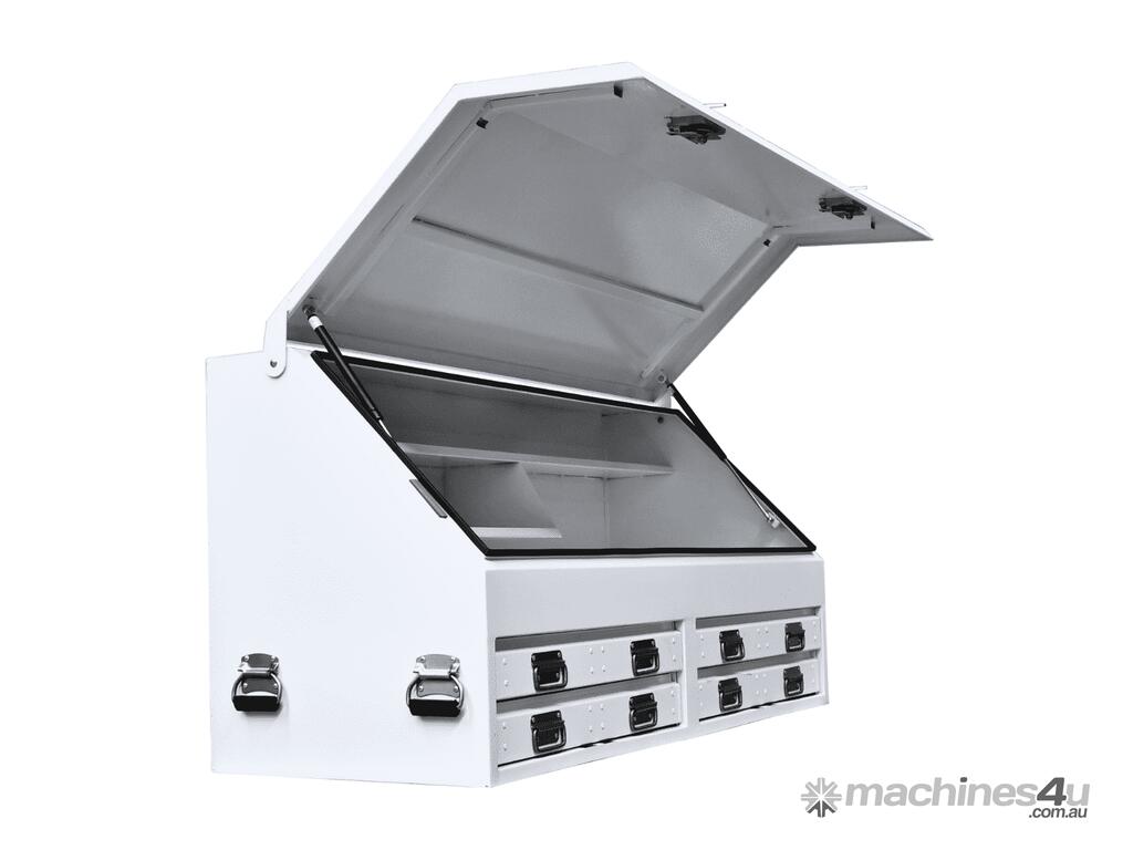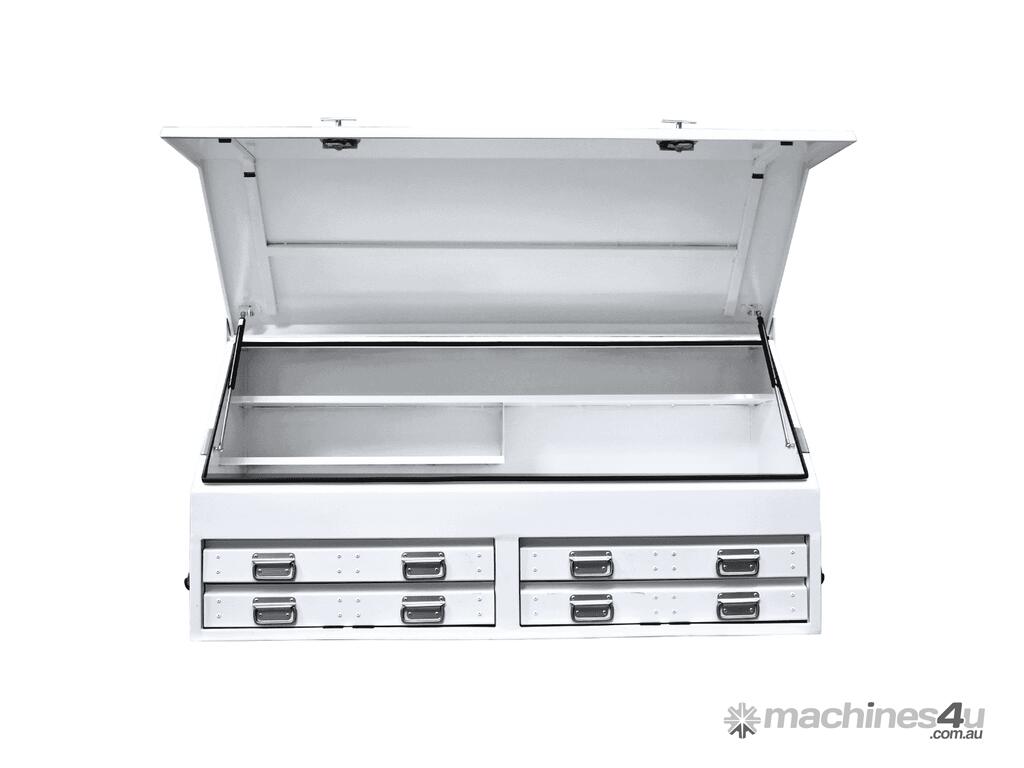 Do you need to take your tools with you in the ute or on the truck and need a heavy duty tool box to handle the bumps well why not try the new Jimy Tools Truck Box. Ideal for tradesman, mines, utes, light trucks, work and service vehicles. This tough box is made from 1.5mm thick steel with a sloping lid that is secured with 2 lockable T-handle catches and has gas struts to hold it open. The top section of the box has 1 full length shelf and 1 half length shelf. The 4 drawers have water gutters, ball bearing runners and an internal lock pin for security. The truck box is finished with a UV stabilized white powder coat finish.