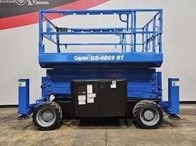 The Genie GS4069 RT rough terrain scissor lift is built for extra-rugged performance and can traverse through uneven, rough terrain environments.