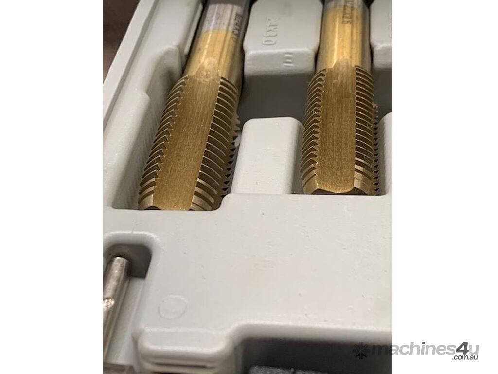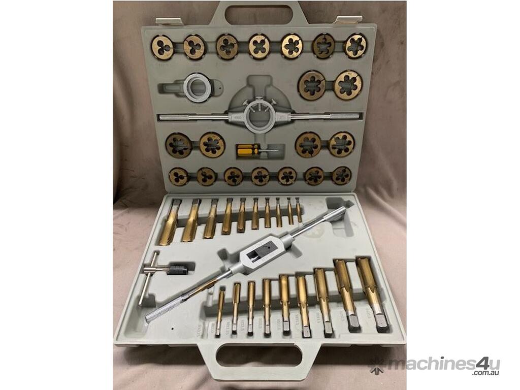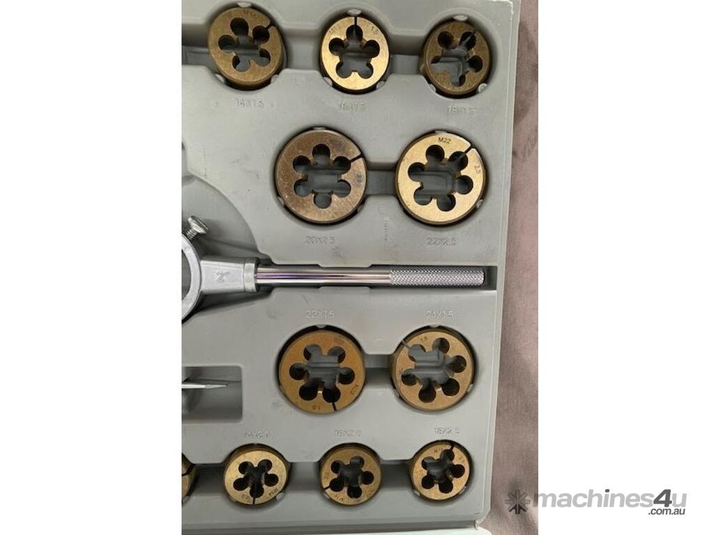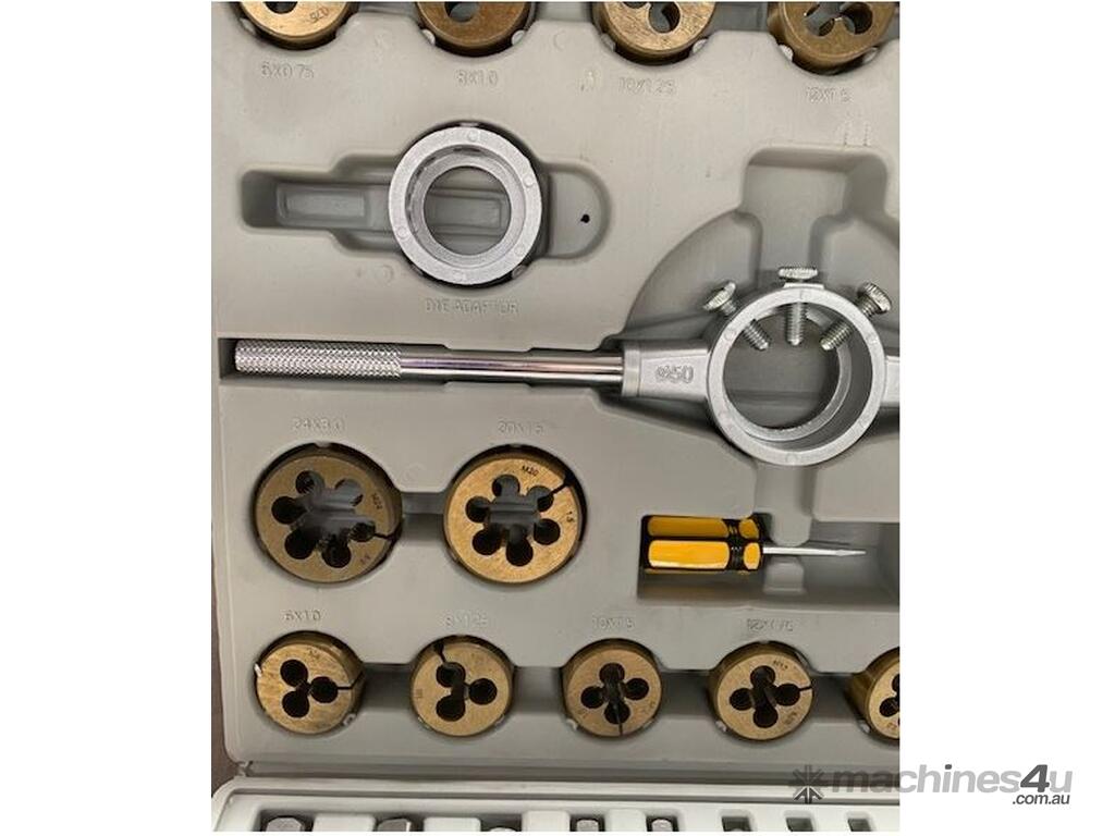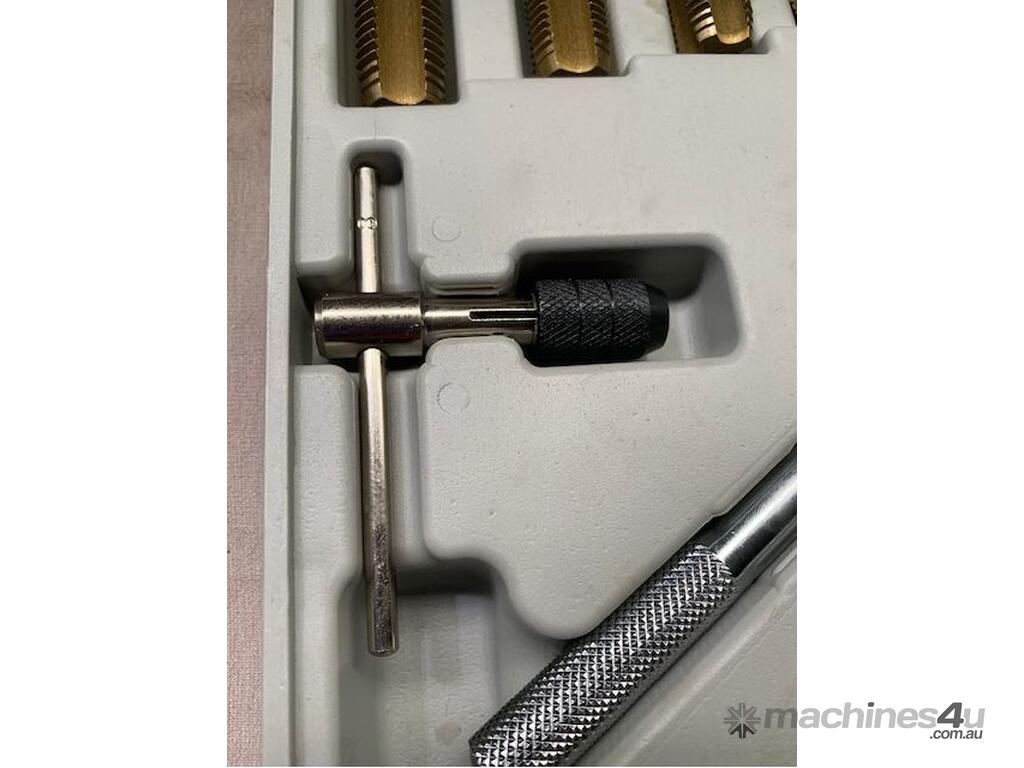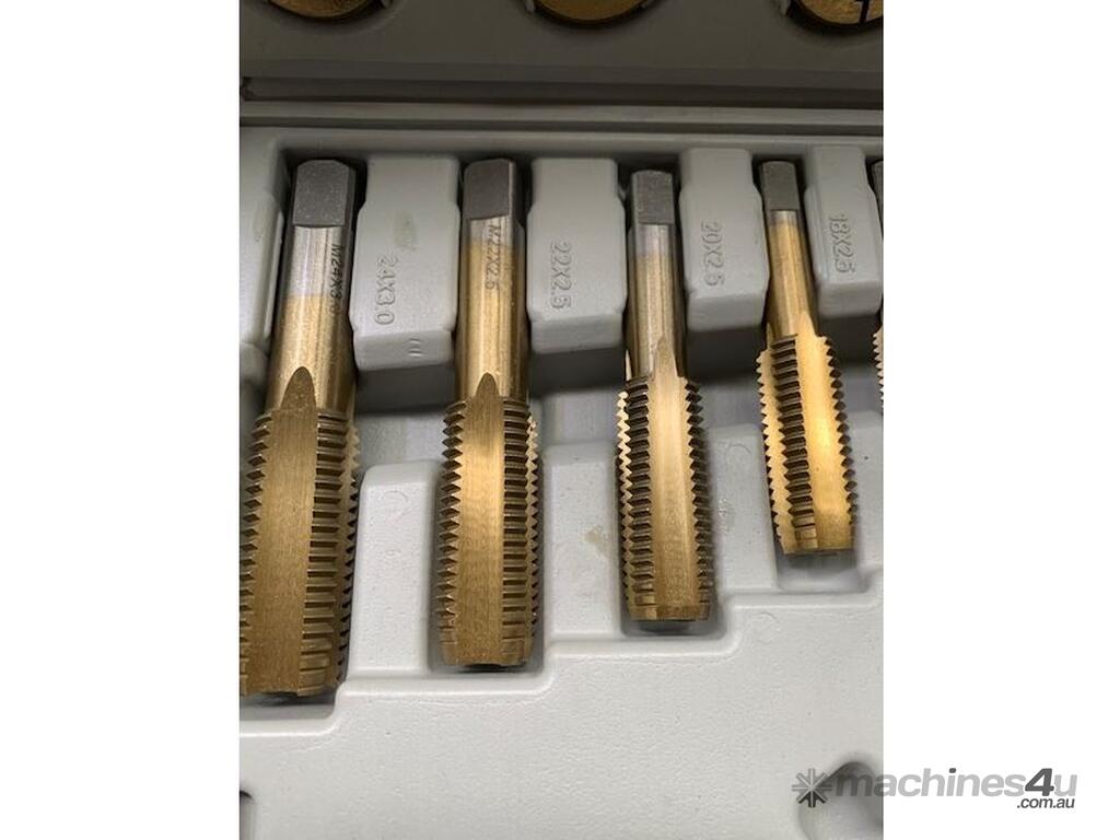 Set includes coarse and fine threads numbered taps and dies from M6 - M24 tap and die, tap handle, die handle, small hand tap and steel case. Fine quality!
