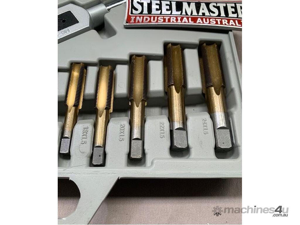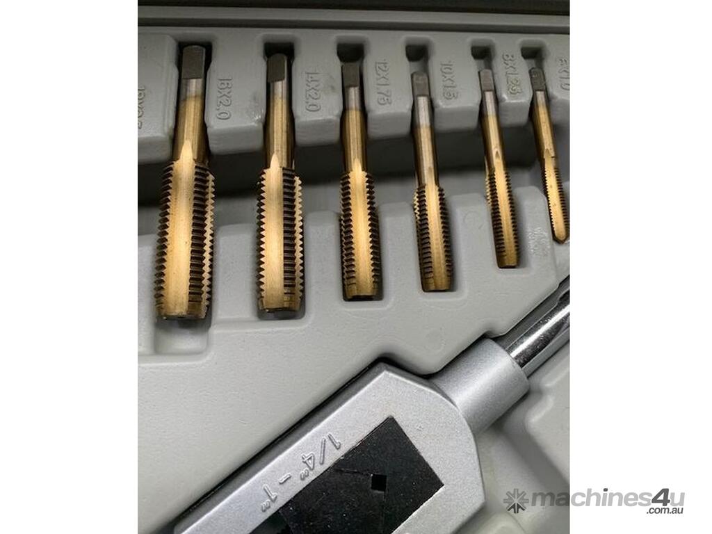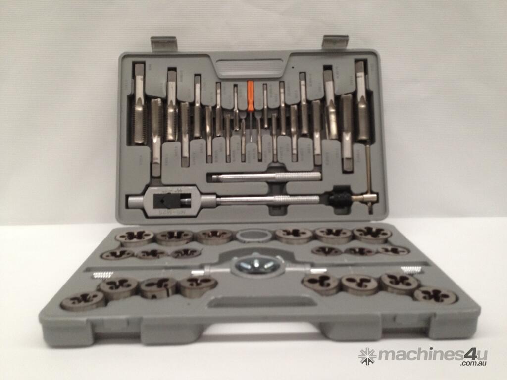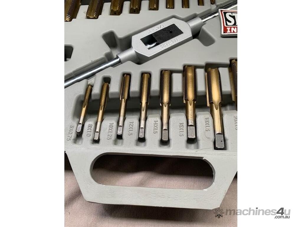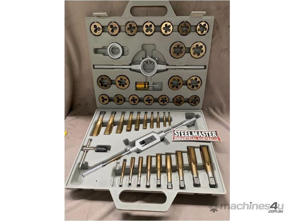 Set includes coarse and fine threads numbered taps and dies from M6 - M24 tap and die, tap handle, die handle, small hand tap and steel case. Fine quality!