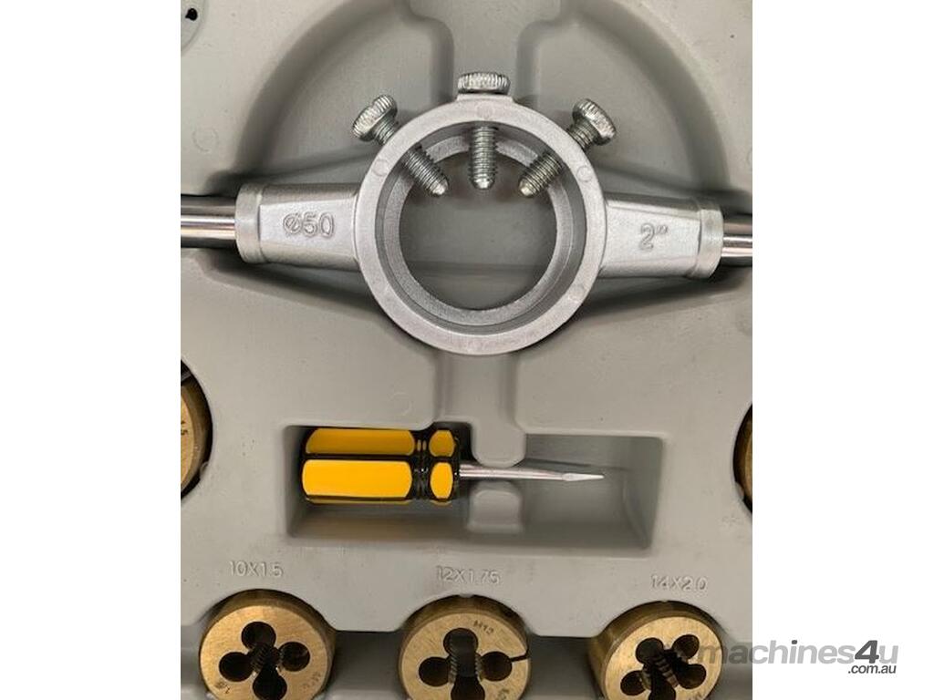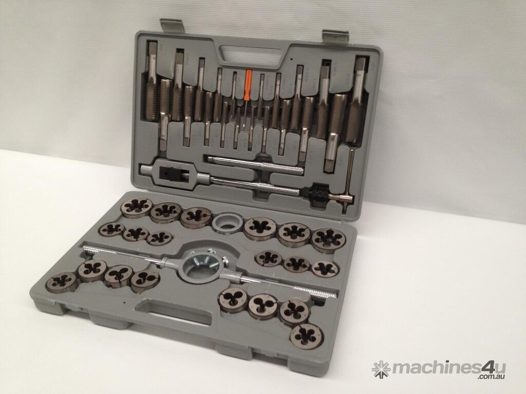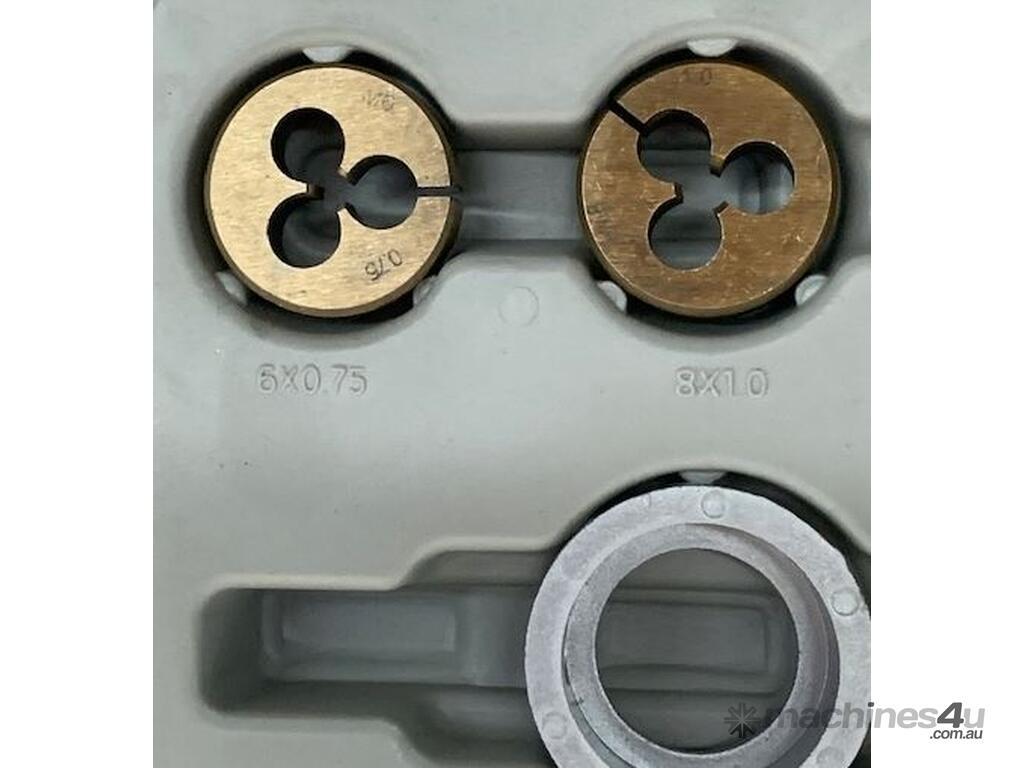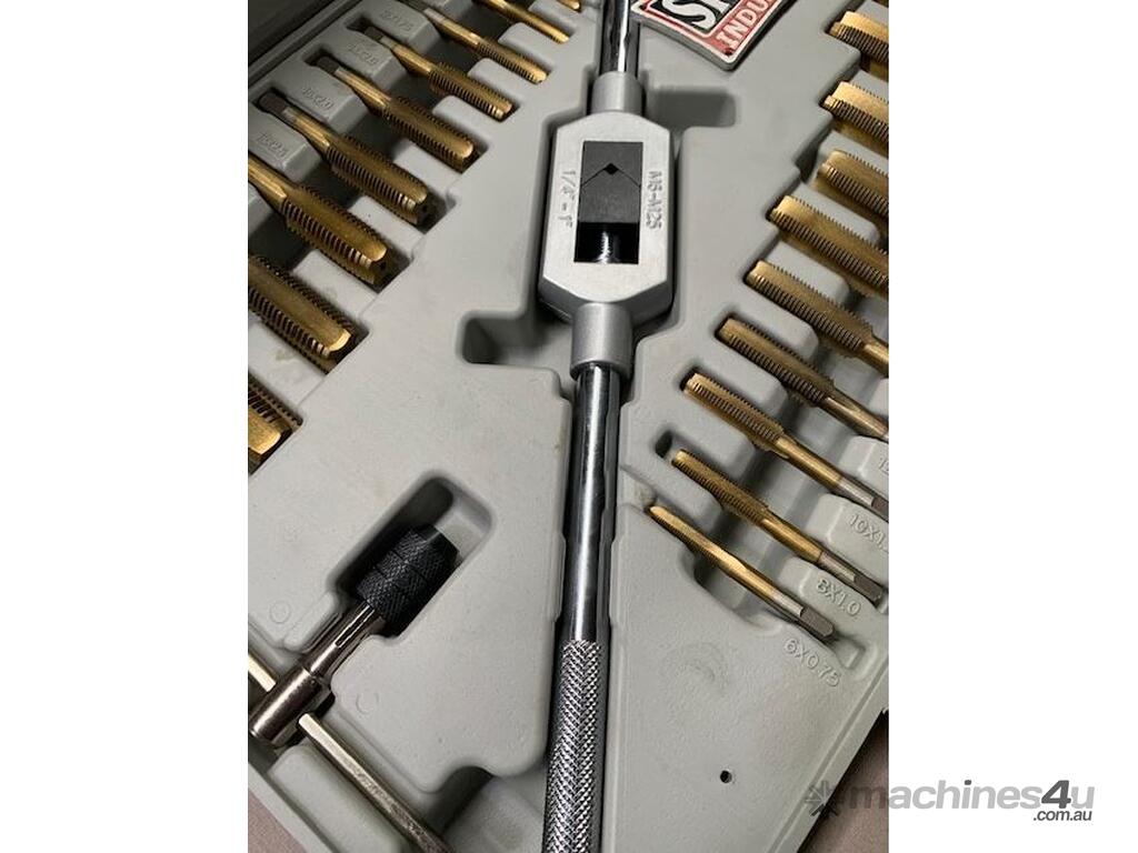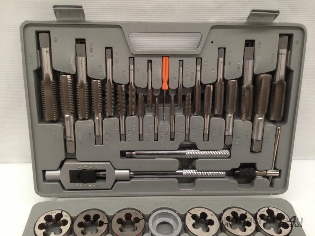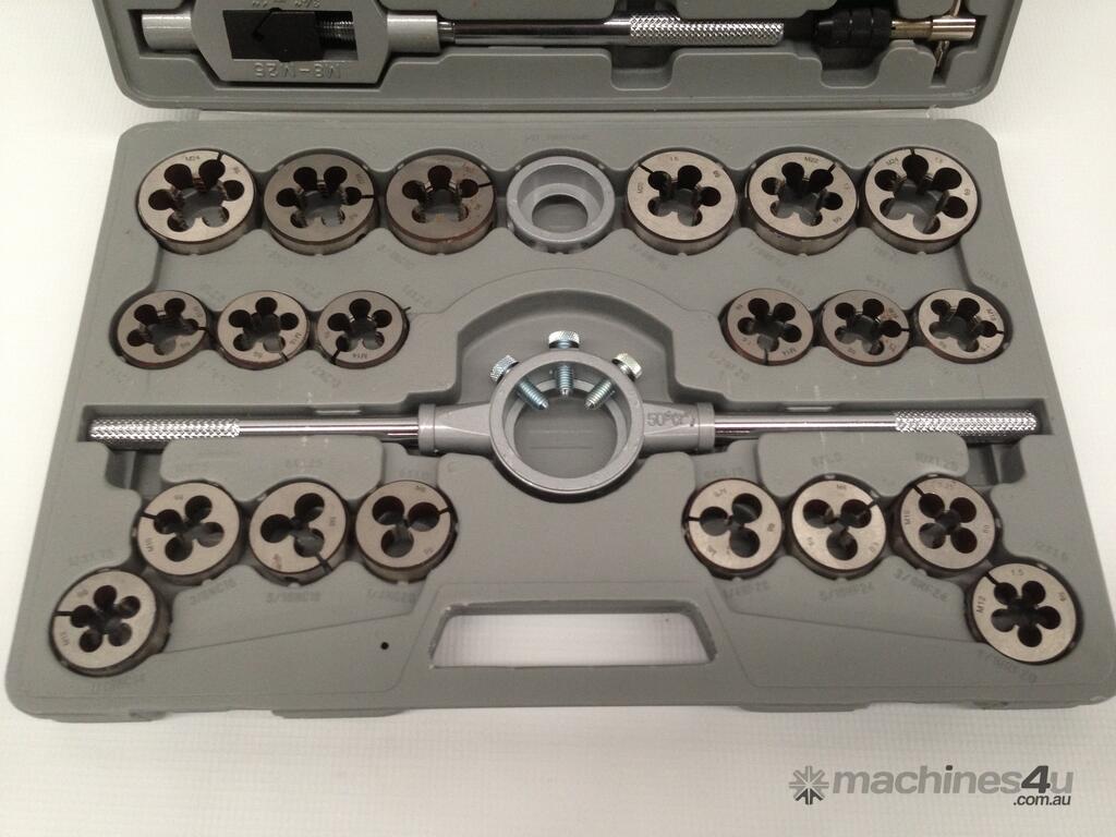 Set includes coarse and fine threads numbered taps and dies from M6 - M24 tap and die, tap handle, die handle, small hand tap and steel case. Fine quality!