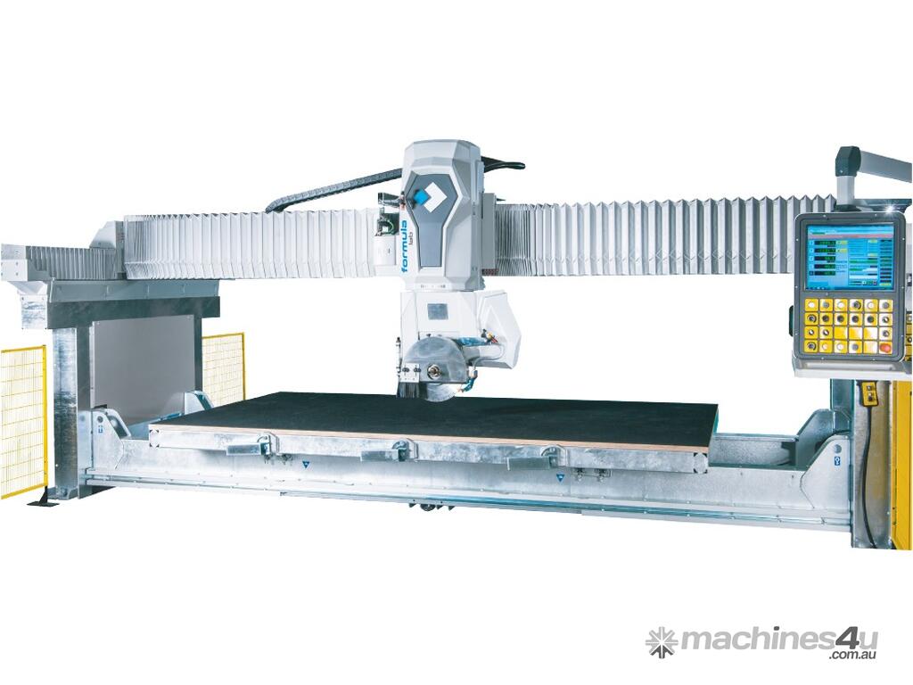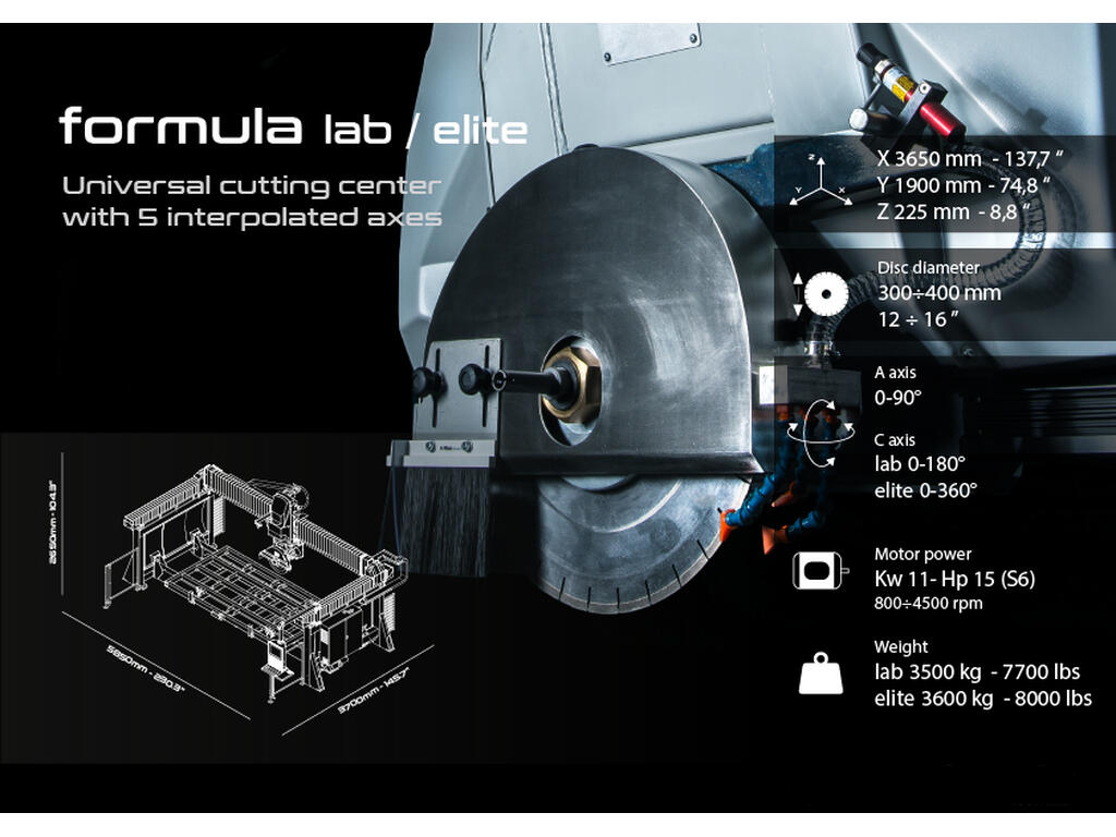 Formula LAB is the new 5-axis interpolated cutting center specifically designed for processing natural and engineered stone, ceramic and ultra-compact materials fully meeting the very parameters – speed, accuracy, working strokes and software interface - required for all tasks connected to efficient slab fabrication encompassing trimming, de-tensioning cuts, mitering, multidirectional and curvilinear jobs, as well as inner cut-outs.