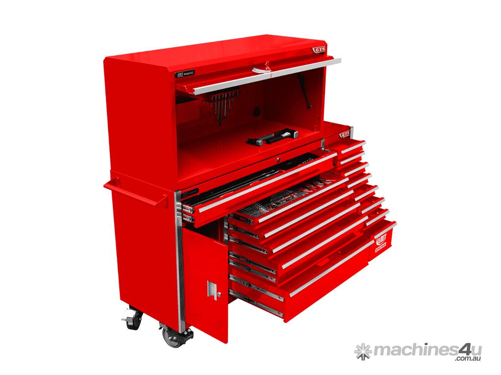 The 14 drawer “Intermediate" hutch tool workshop from Jimy Tools offers a great range of tools for the professional mechanic. The kit consists of a hutch top box and an 11-drawer roller cabinet, all have been powder coated with a tough industrial finish, 1.2mm thick steel, fully lockable with rear internal locking system, dual gas strut system for the hutchandball bearing slide drawers with twin slides on the deeper drawers.