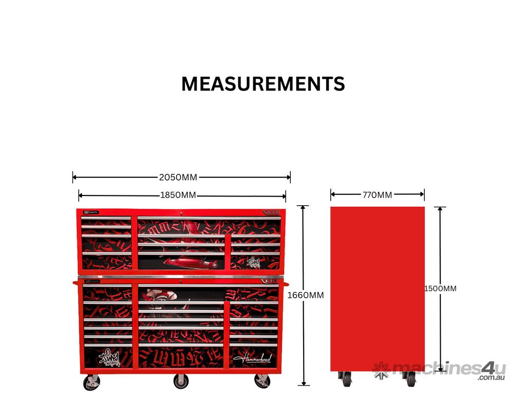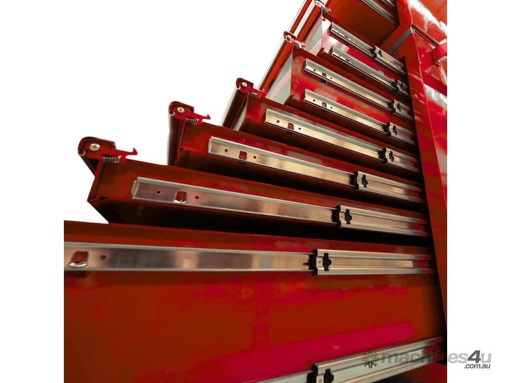 Jimy tool boxes are built to last! Tough industrial powder coating, 1.2mm gauge steel thickness, fully lockable bearing slide rails on the drawers with twin slide rails on the deeper drawers. Drawers fitted with Click-lock mechanism.