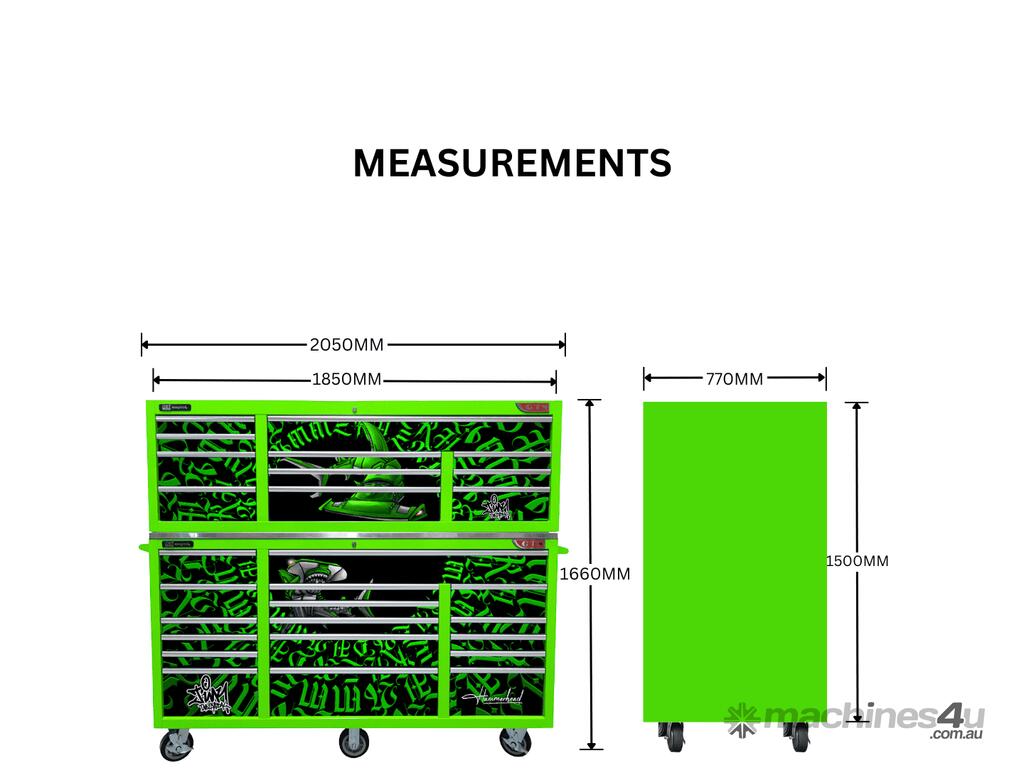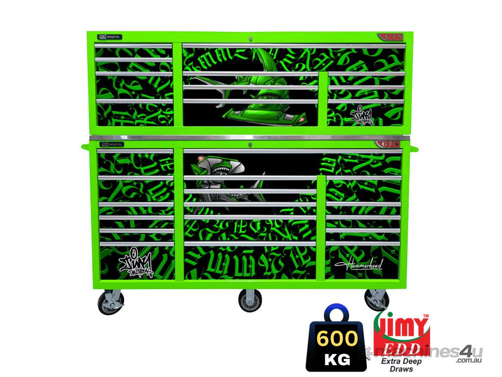 Jimy tool boxes are built to last! Tough industrial powder coating, 1.2mm gauge steel thickness, fully lockable bearing slide rails on the drawers with twin slide rails on the deeper drawers. Drawers fitted with Click-lock mechanism.