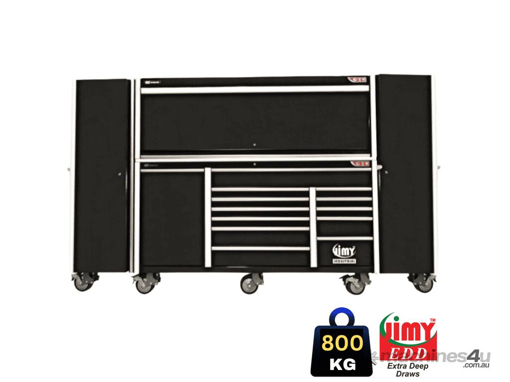 Jimy tool boxes are built to last! Tough industrial powder coating, 1.2mm steel thickness, fully lockable with ball bearing slide rails on the drawers. The deeper drawers have twin slide rails giving them a capacity of >100Kg.