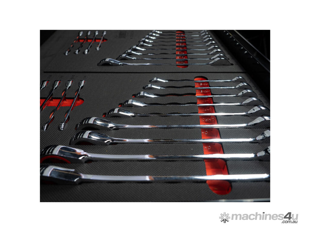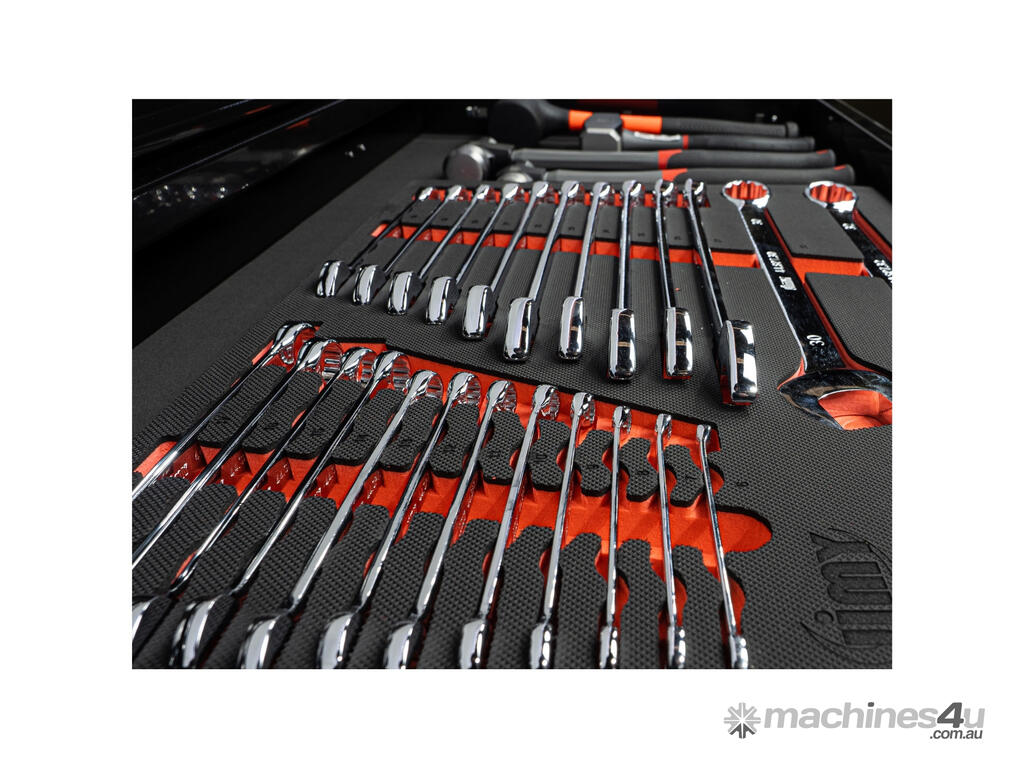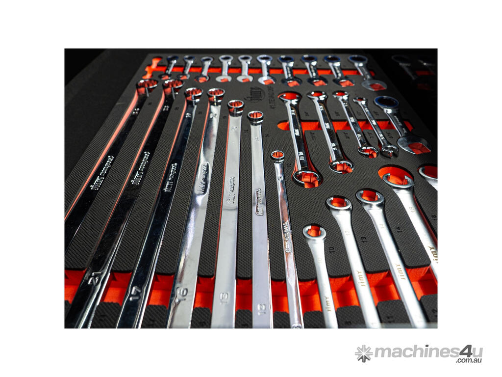 The 14 drawer mega mechanics tool kit from Jimy Tools offers a wide range of tools for the trade’s person. The kit consists of a 14 drawer heavy duty roller cabinet that has been powder coated with a tough industrial finish, 1.2mm thick steel, fully lockable with rear internal locking system andball bearing slide drawers with twin slides on the deeper drawers. Included are metric 4mm - 32mm and SAE 5/32" - 1-1/4" sockets and a full complement of 1/4", 3/8" and 1/2" drive socket accessories including ratchets, breaker bars, extensions bars from 50mm up to 900mm long plus metric and SAE impact sockets. There are ring open end ratchet and standard spanners in both metric and SAE, screwdrivers, pliers and even a 1/2" drive air impact wrench for the complete list of contents please check out the table below. With the high density foam drawer inserts you can easily see if you have left a tool on the job.