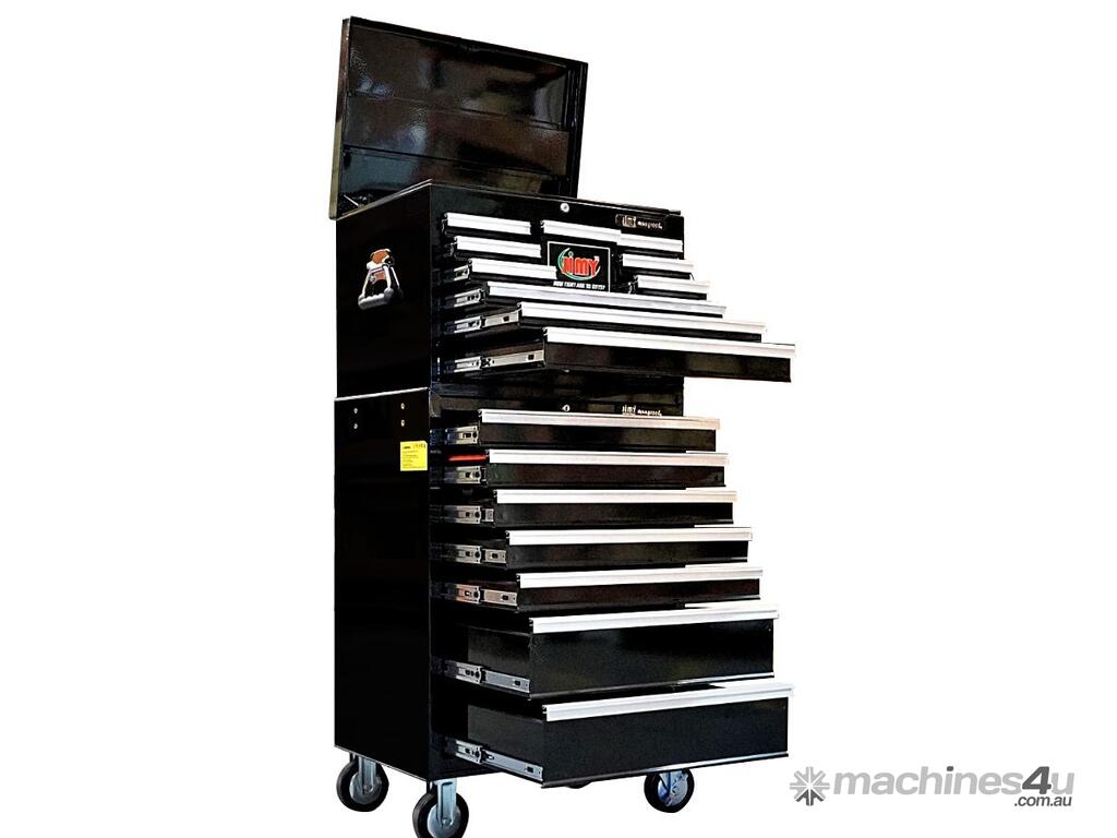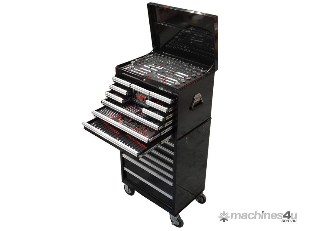 Commonly known as the ‘BLACK DEVIL’ this kit consists of a 10 drawer top box and 7 drawer roller cabinet that have been powder coated with a tough industrial finish, 1.2mm thick steel, fully lockable with rear internal locking system, dual gas strut system for lidandball bearing slide drawers. Included are metric and SAE sockets in both standard and deep length (Cr-V) with a full complement of 1/4”, 3/8” and 1/2” drive socket accessories including ratchets, breaker bars, extensions bars and universals. There are ring open end ratchet and standard spanners in both metric and SAE, screwdrivers and pliers for the complete list of contents please check out the table below. With the high density foam drawer inserts you can easily see if you have left a tool on the job.