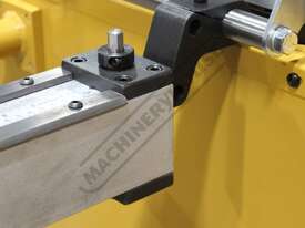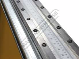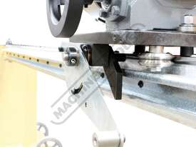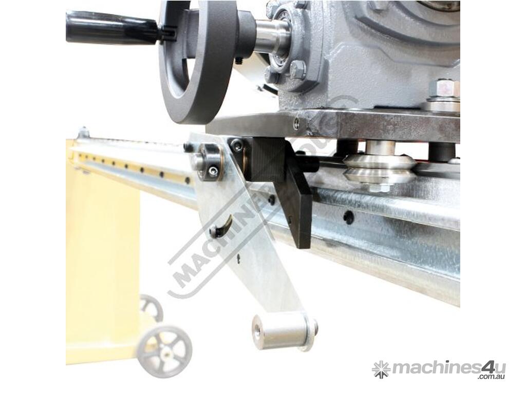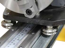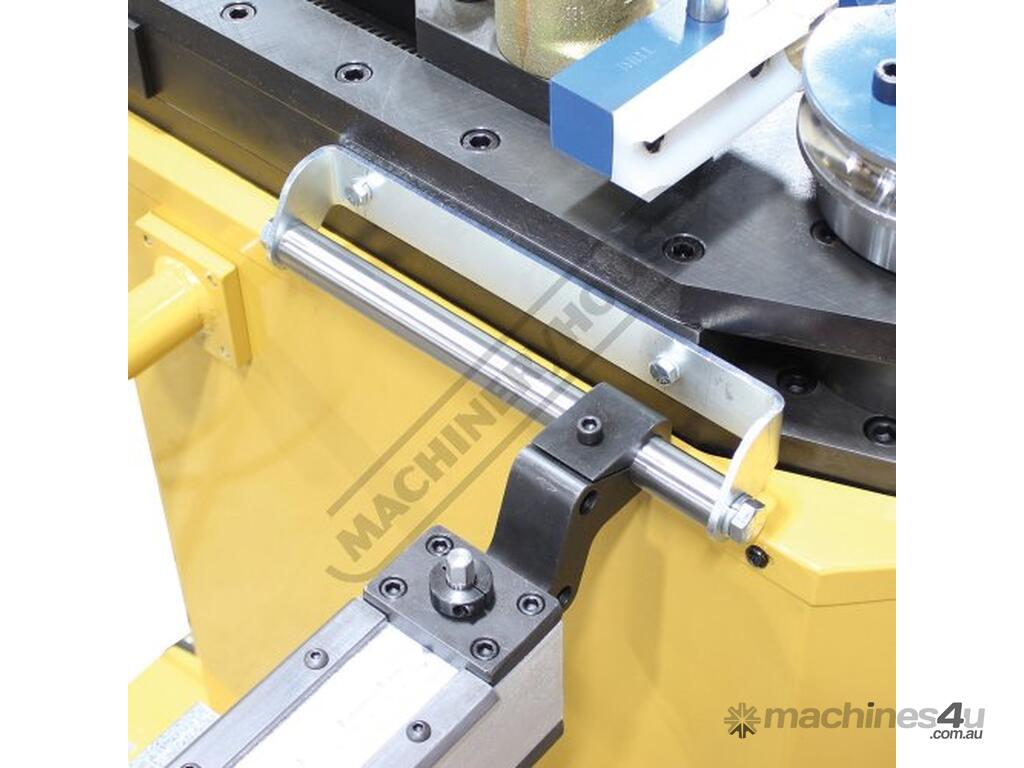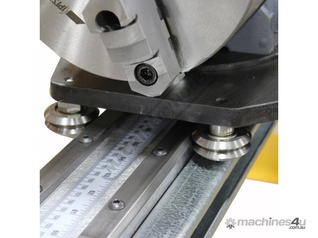 The table comes with an 203.2mm three jaw chuck with 63.5mm thru hole that allows for longer pieces of tubing than the table length. Chuck can handle up to 114.3mm OD. The minimum OD is 6.35mm. The table has a linear indicator strip so the operator can set up accurate distances between bends. Mechanical stops can be positioned for the start of each bend. Using the mechanical stops is very beneficial for repeatability on bigger production runs. Another nice feature of the table is that the positioning carriage rolls on a precision V block rail and rides the rail using V-block bearings. These bearings are placed on eccentric shafts, which allows for tolerance adjustment allowing the most accurate results.