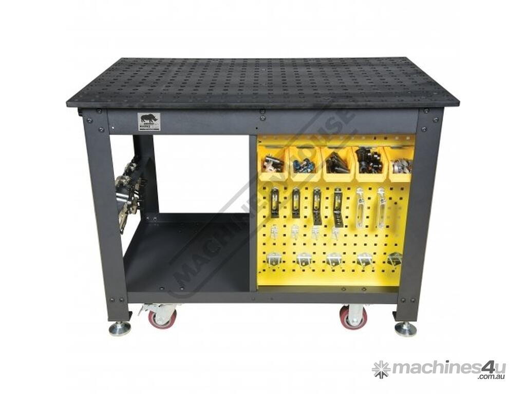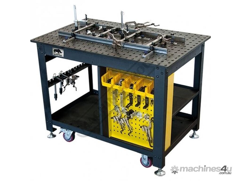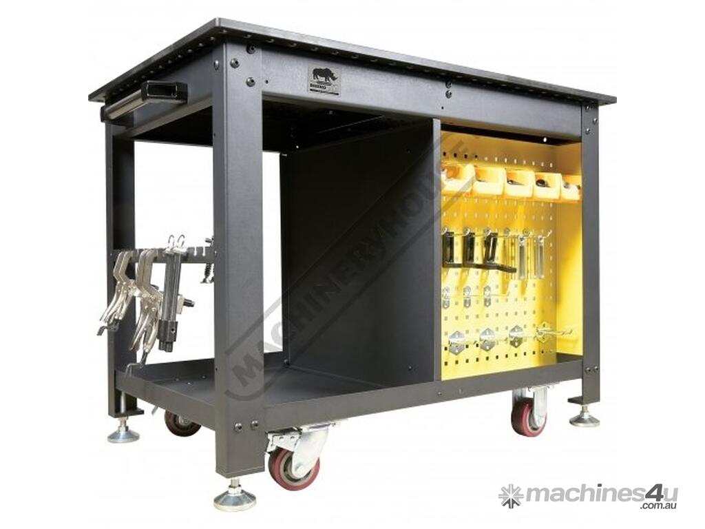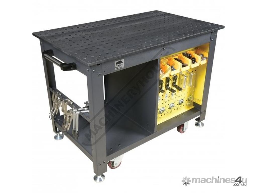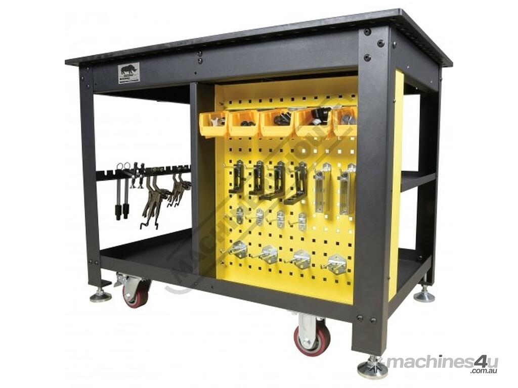The Rhino Cart Mobile Fixturing Station is a turnkey system for fixturing and clamping in welding and fabrication. Clamp and fixture at any point on the reversible, flat, nitrided (heat treated) 1200 x 750mm tabletop for accuracy in all of your setups.