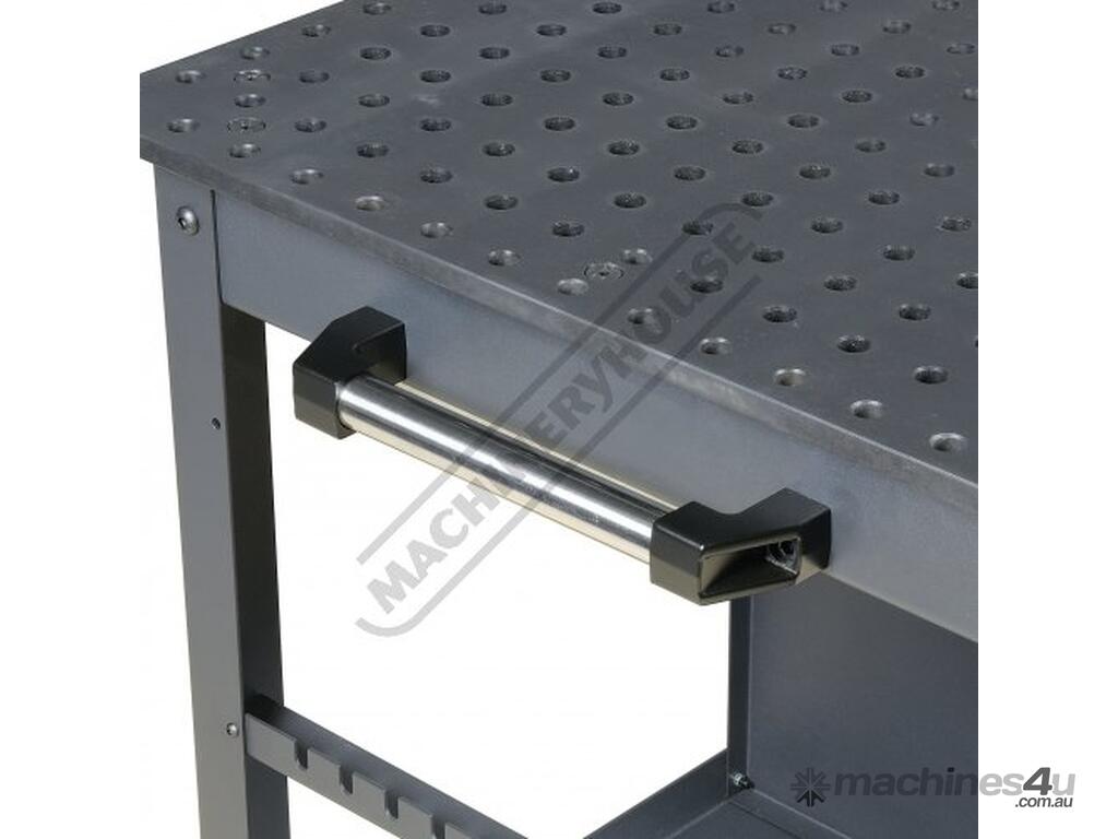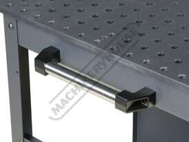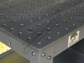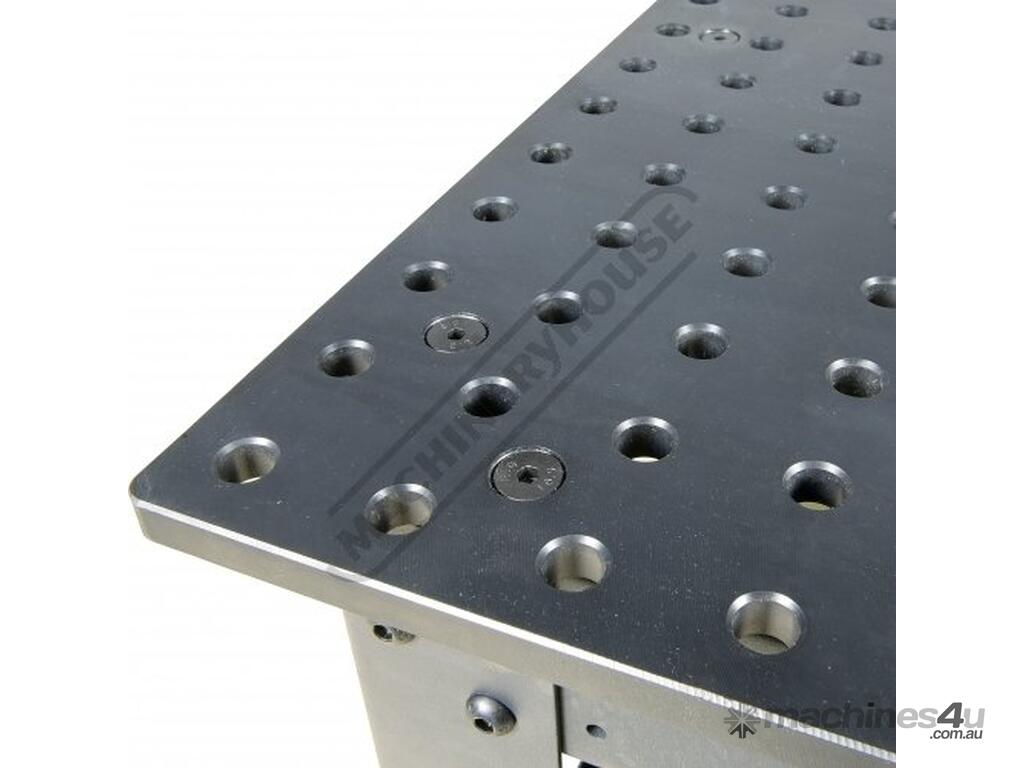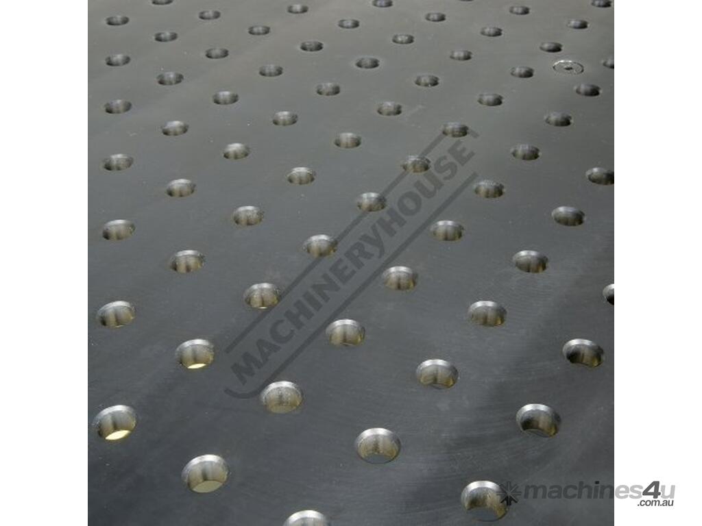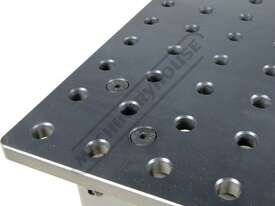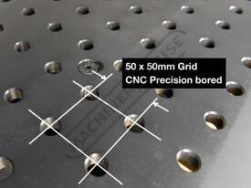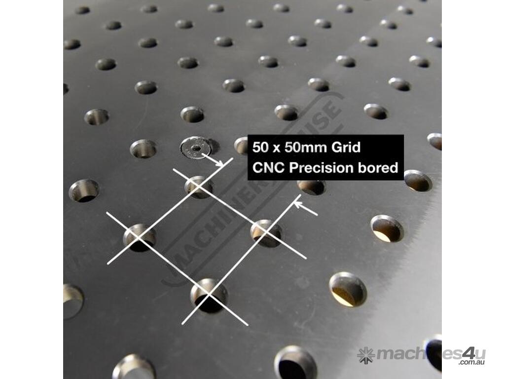 16mm thick steel plate reversible tabletop with nitrided black oxide protective finish for wear, rust and weld spatter resistance. Accurately position parts in CNC precision bored 16mm diameter holes in 50 x 50mm spacing pattern