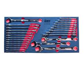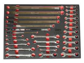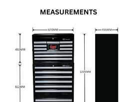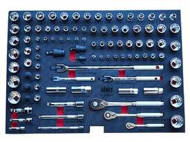 Commonly known as the ‘BLACK DEVIL’ this kit consists of a 10 drawer top box and 7 drawer roller cabinet that have been powder coated with a tough industrial finish, 1.2mm thick steel, fully lockable with rear internal locking system, dual gas strut system for lidandball bearing slide drawers. Included are metric and SAE sockets in both standard and deep length (Cr-V) with a full complement of 1/4”, 3/8” and 1/2” drive socket accessories including ratchets, breaker bars, extensions bars and universals. There are ring open end ratchet and standard spanners in both metric and SAE, screwdrivers and pliers for the complete list of contents please check out the table below. With the high density foam drawer inserts you can easily see if you have left a tool on the job.