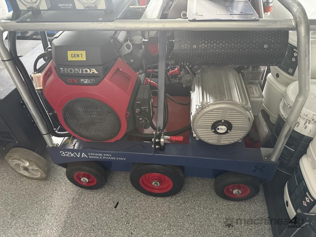 Honda generator with 2 motors 32KVA 240v with 415V able to roll on flat surfaces with stairs a lift system can be used or either can run longer 3 phase cables to reach your site.