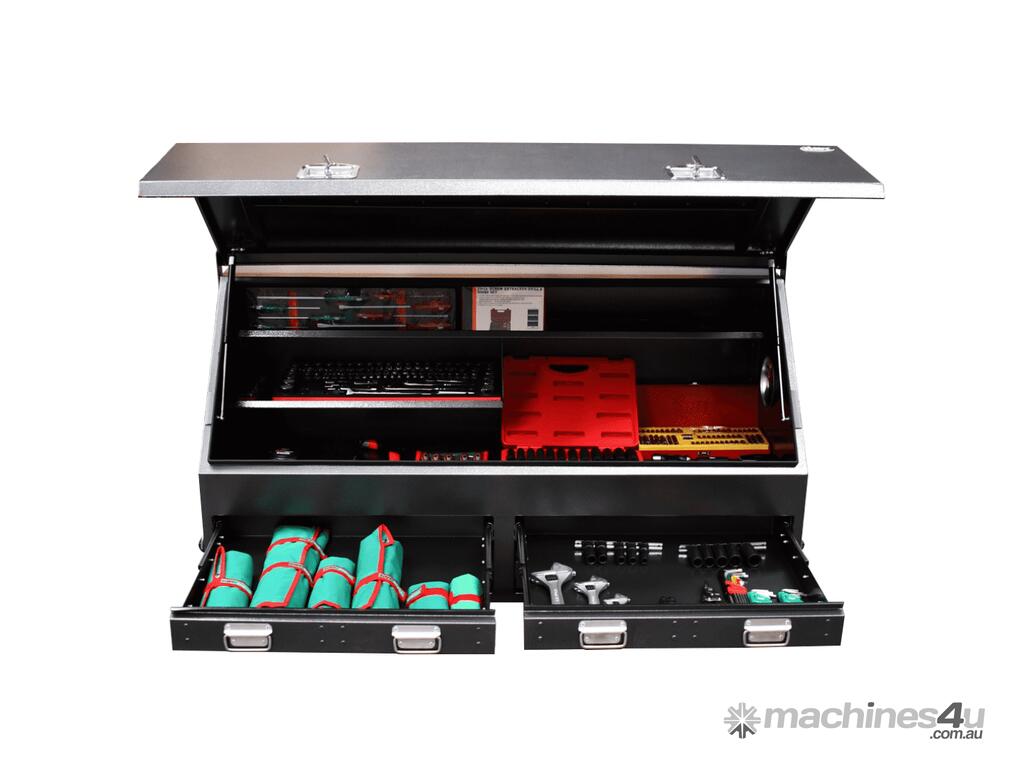 Do you need to take your tools with you in the ute or on the truck and need a heavy duty tool box to handle the bumps well why not try the new Jimy Tools Truck Box? This tough box is made from 1.5mm thick steel with a sloping lid that is secured with 2 lockable T-handle catches and has gas struts to hold it open. The top section of the box has 1 full length shelf and 1 half-length shelf. The 4 drawers have water gutters, ball bearing runners and an internal lock pin for security. The truck box is finished with Hammertone finish.