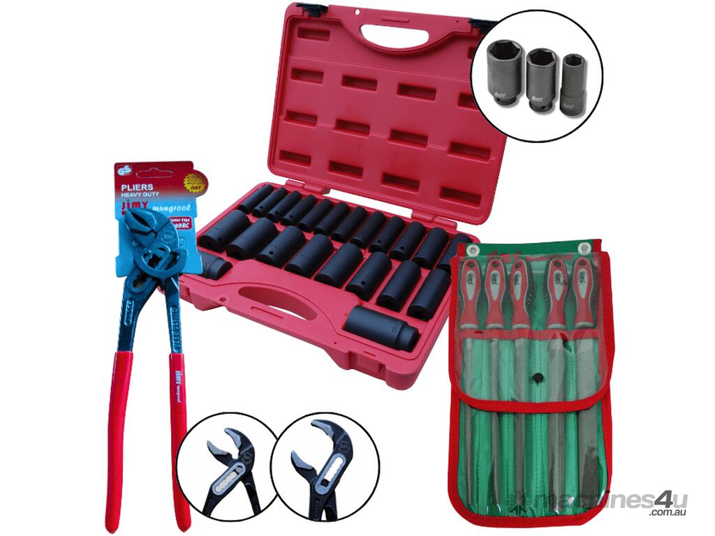 Some of the items included with this kit are, 81 piece socket and accessories foam insert with 1/4", 3/8" and 1/2" drive sockets in metric from 4mm up to 32mm and imperial from 5/32" up to 1-1/4" with ratchets, extensions and a 1/2" breaker bar also ratchet and standard ring open end spanners in metric and SAE, 1/2"dr deep metric impact sockets, 27piece 3/4" drive set, 3/4" impact sockets, drill bits, screwdrivers, pliers, hammers etc for the full list check the content list below.