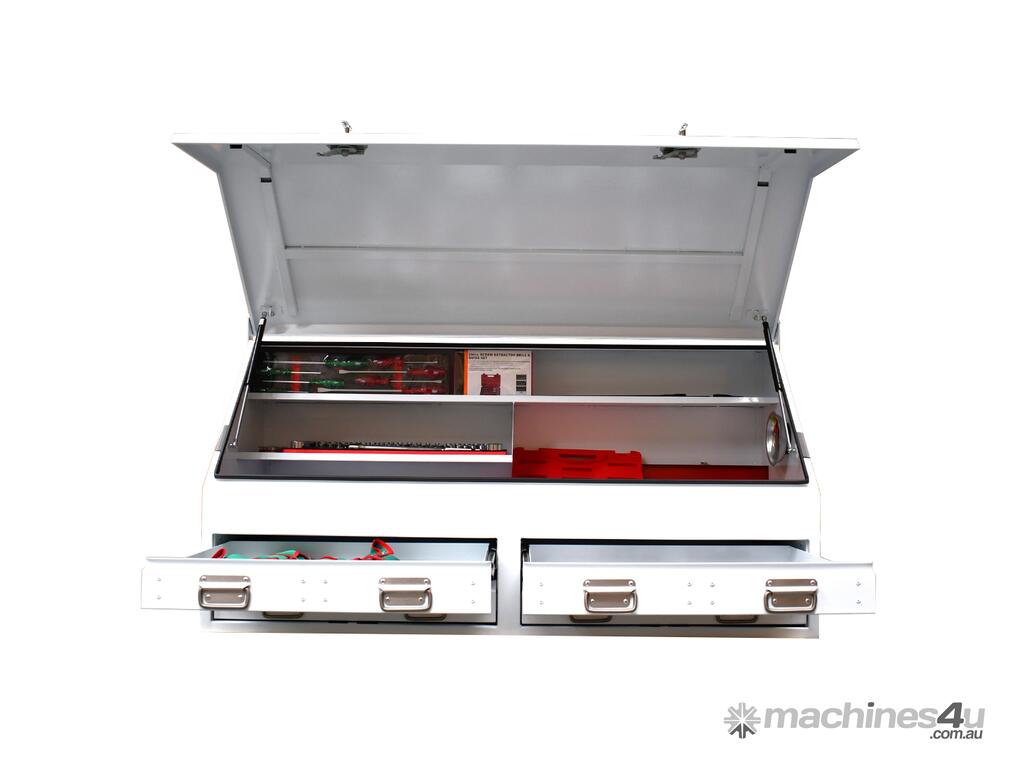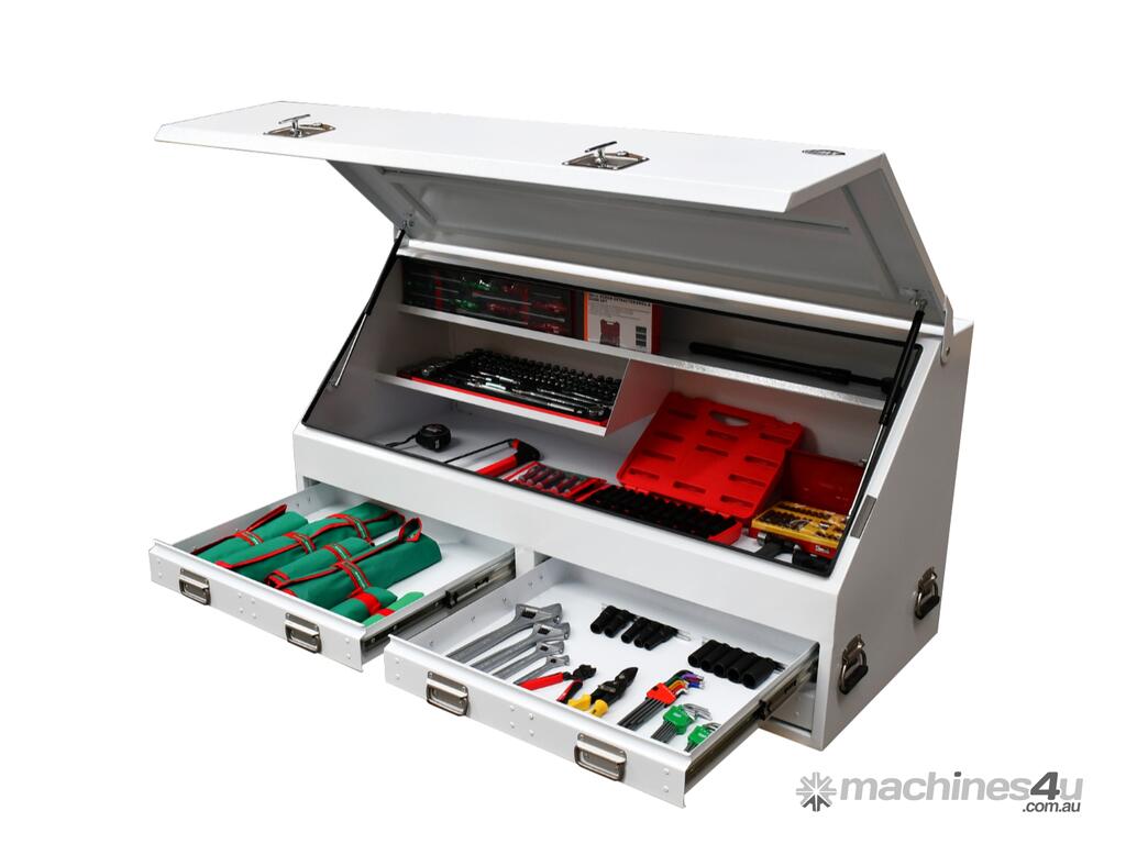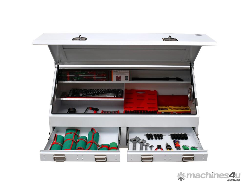 Do you need to take your tools with you in the ute or on the truck and need a heavy duty tool box to handle the bumps well why not try the new Jimy Tools Truck Box? This tough box is made from 1.5mm thick steel with a sloping lid that is secured with 2 lockable T-handle catches and has gas struts to hold it open. The top section of the box has 1 full length shelf and 1 half-length shelf. The 4 drawers have water gutters, ball bearing runners and an internal lock pin for security. The truck box is finished with Hammertone finish.