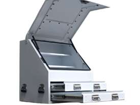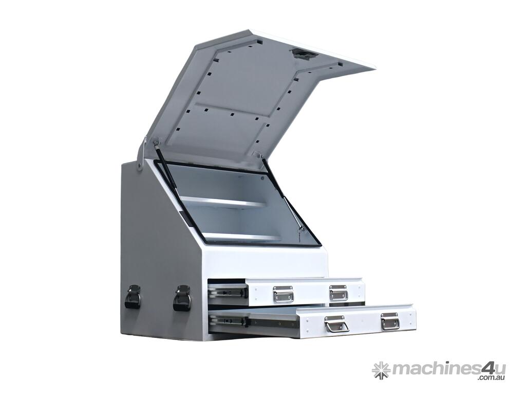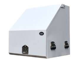 These boxes are made from 1.5mm thick steel; the sloped lid has a piano hinge and 2 gas struts. Fully enclosed lid for improved security and weather protection. There are 2 drawers on roller bearing slides that come with water gutters. The whole box is finished with a Hammertone finish.