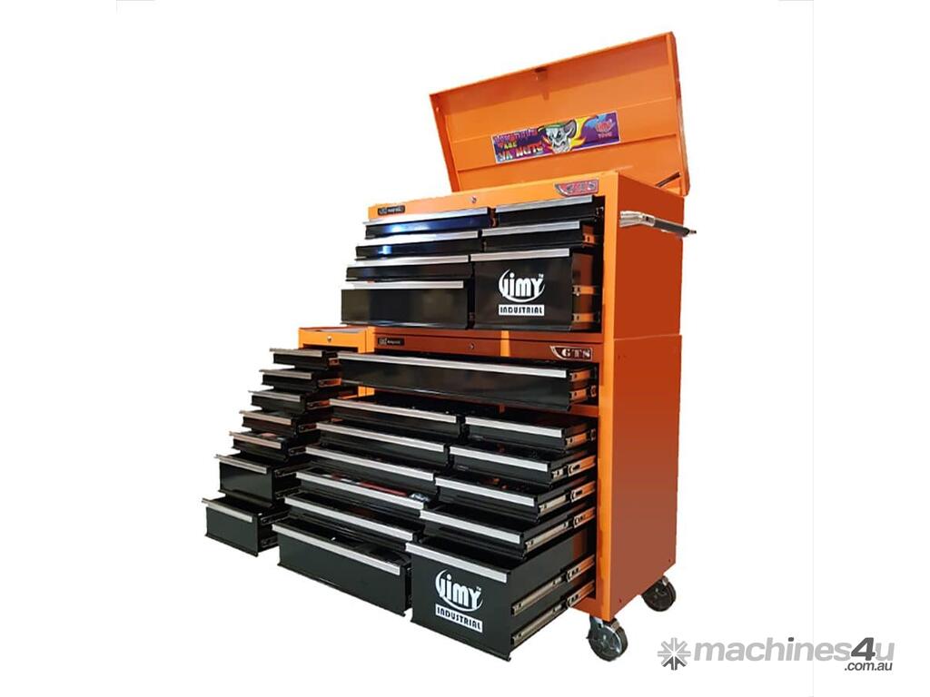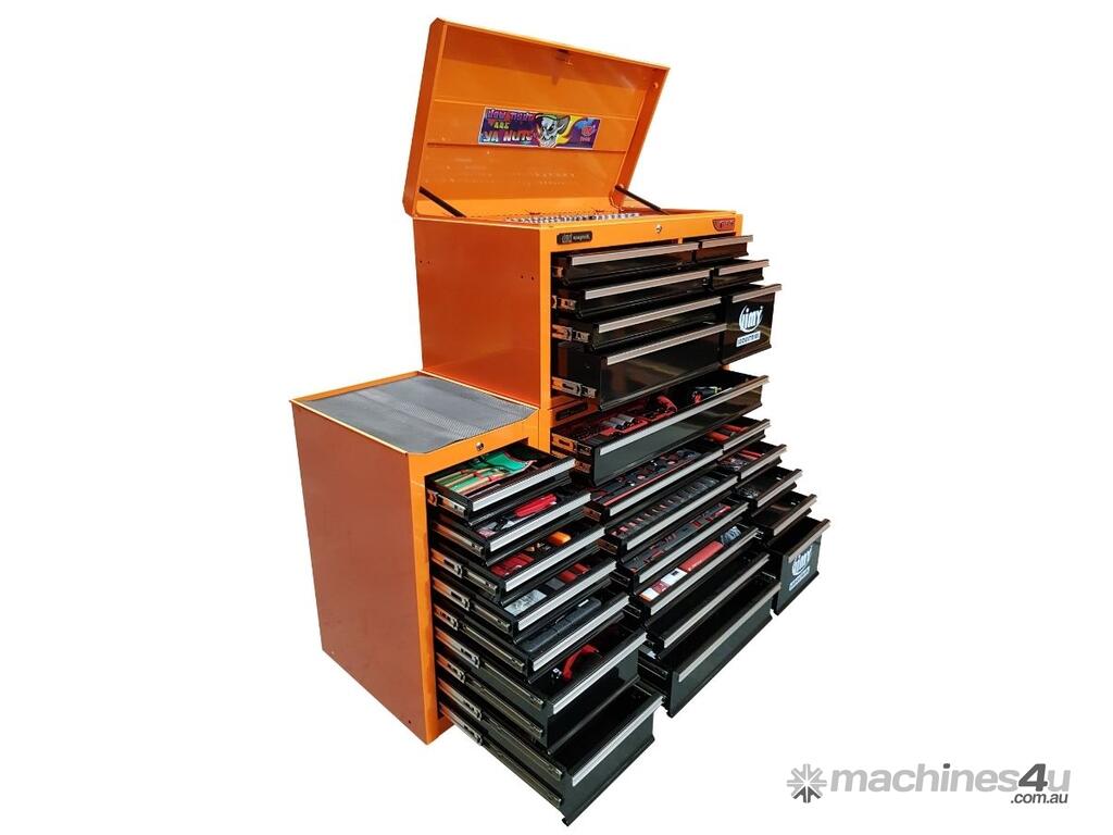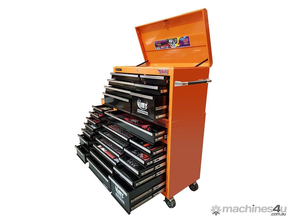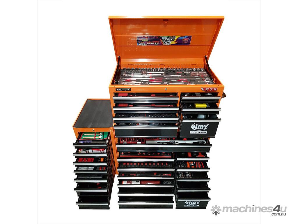 The 26 drawer “Monster Mechanic" tool kit from Jimy Tools offers a wide range of tools for the tradesperson. The kit consists of a 7 drawer top box and a 12 drawer roller cabinet with a 7 drawer side box attached all have been powder coated with a tough industrial finish, 1.0mm thick steel, fully lockable with rear internal locking system, dual gas strut system for lidandball bearing slide drawers with twin slides on the deeper drawers.