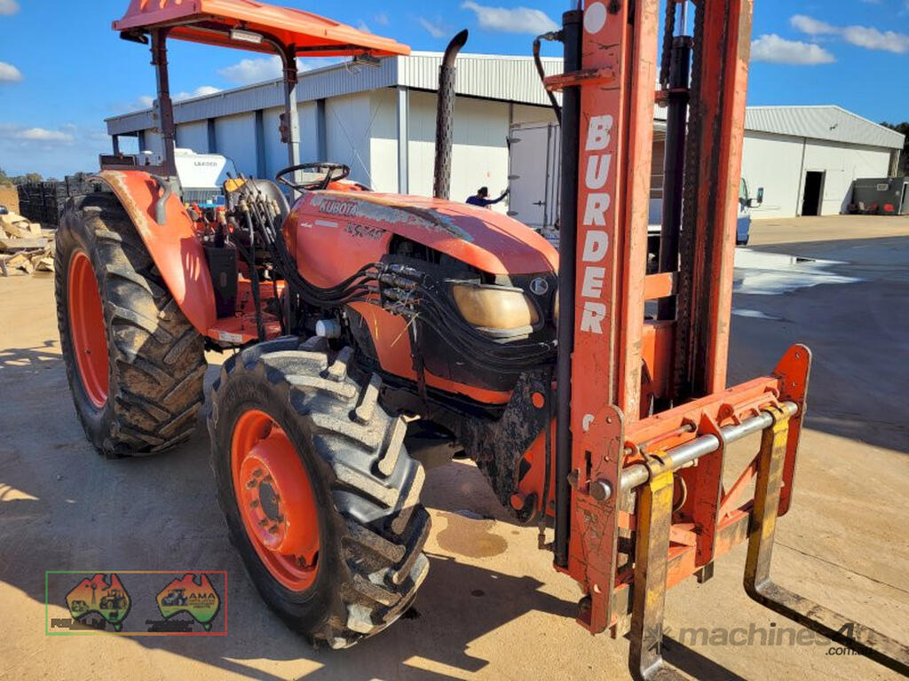 2009 Kubota M540 FWA Tractor with 1.5t Forklift Tower ~ 95Hp, 3.8Ltr, 4cyl Turbo diesel engine ~ 9,890.8 Hrs ~ H/duty Burder 1.5ton front mount Forklift Tower with pallet forks ~ Well maintained & dealership serviced ~ 3pl ~ PTO ~ Dual remotes ~ Tyres R=50% F=80% ~ Starts, runs, drives & operates well ~ Current Vic Rego XKL-562