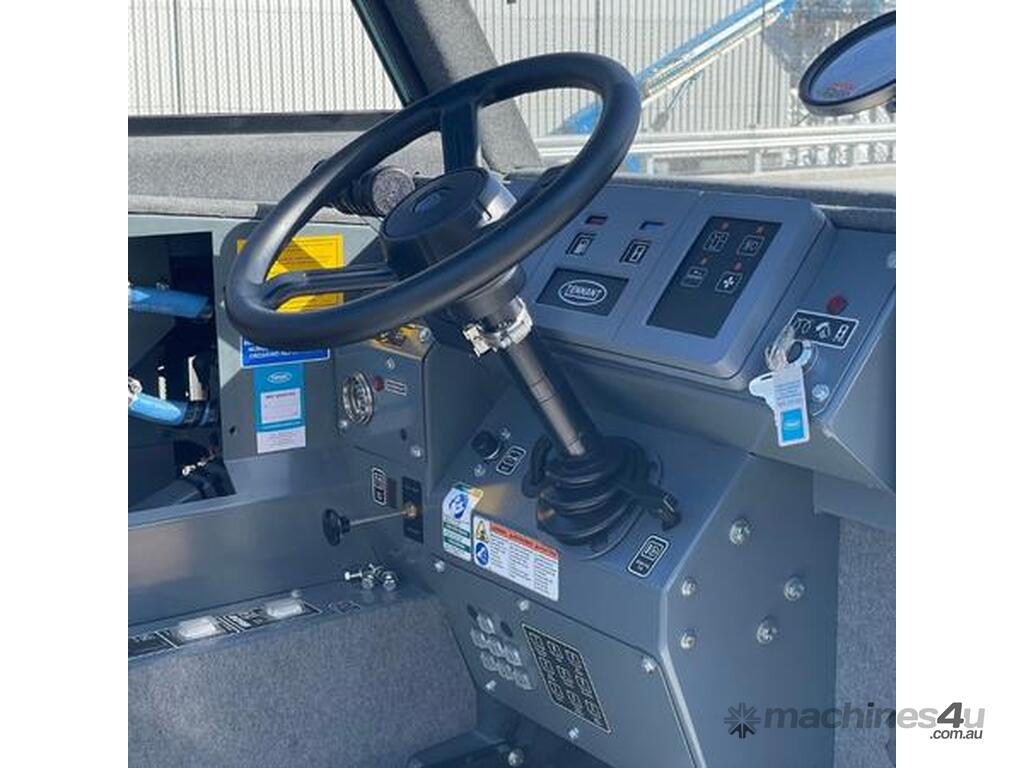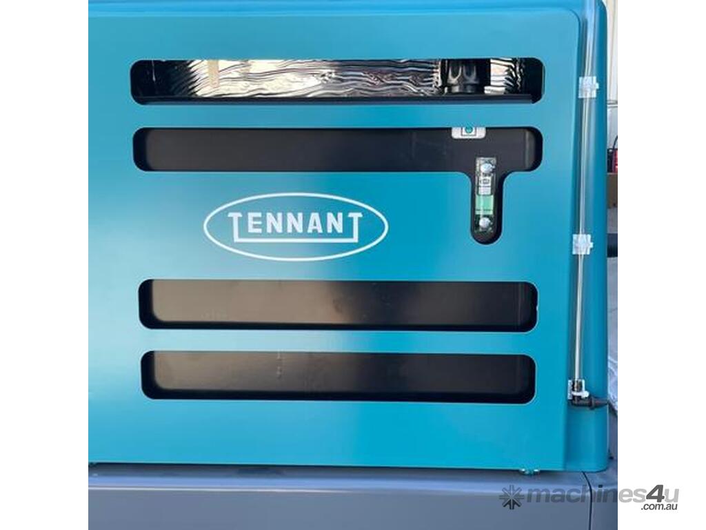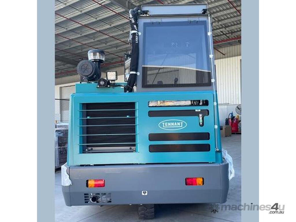 Tennant diesel-powered ride-on sweeping machine complete with side broom, main broom, alarm-flash, regenerative filter system, cab and vacuum wand.