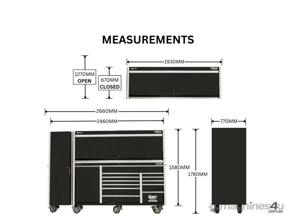 Jimy tool boxes are built to last! Tough industrial powder coating, 1.2mm steel thickness, fully lockable with ball bearing slide rails on the drawers. The deeper drawers have twin slide rails giving them a capacity of >100 kg.