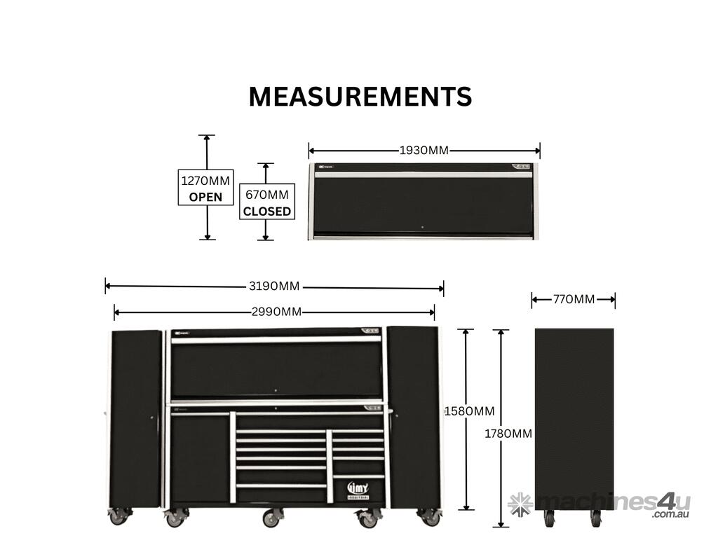 Jimy tool boxes are built to last! Tough industrial powder coating, 1.2mm steel thickness, fully lockable with ball bearing slide rails on the drawers. The deeper drawers have twin slide rails giving them a capacity of >100 kg.