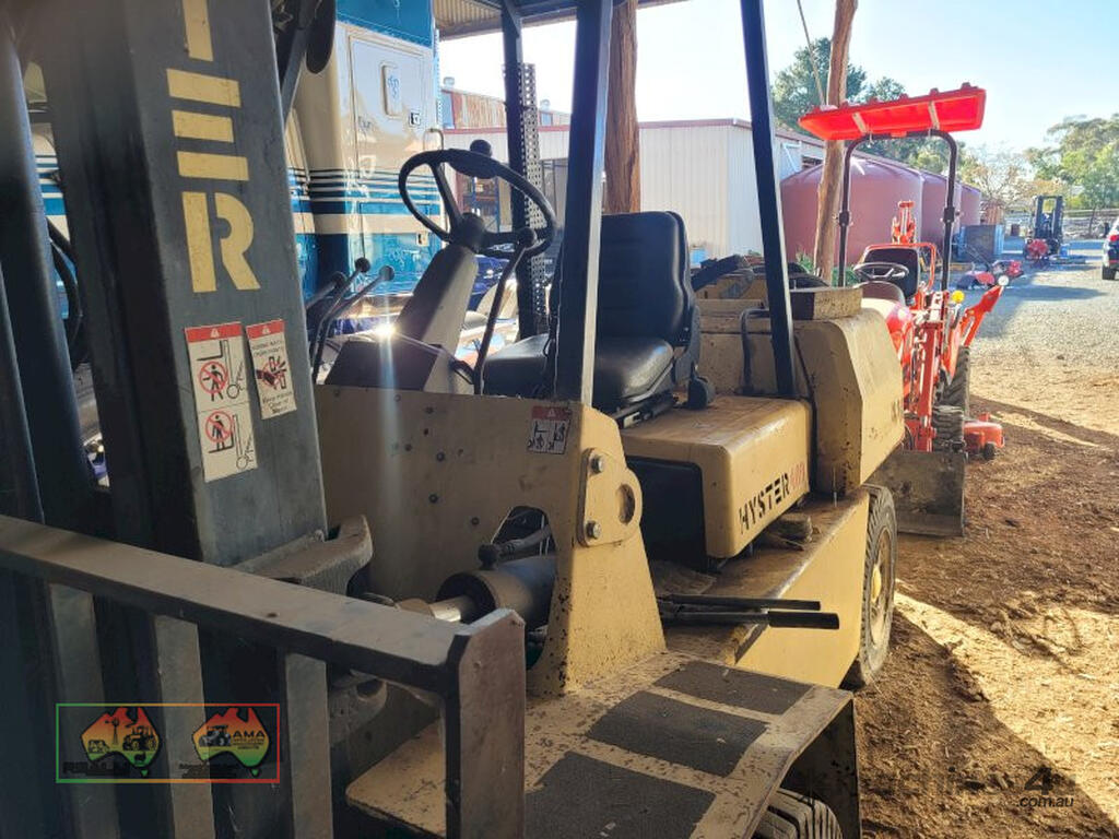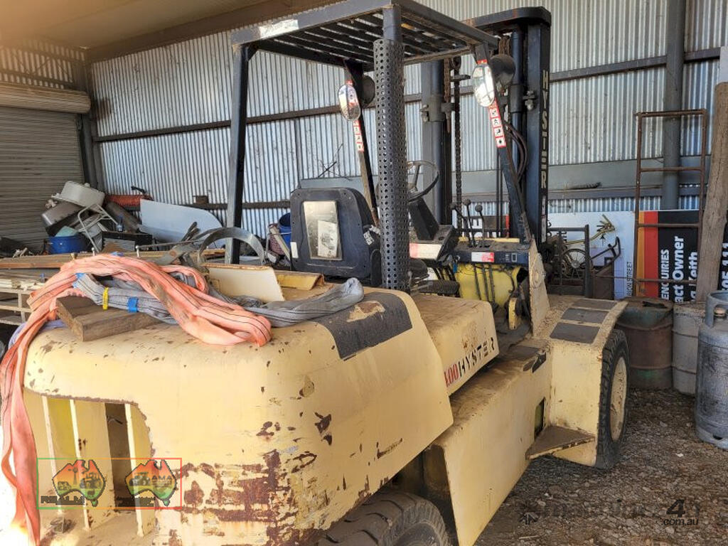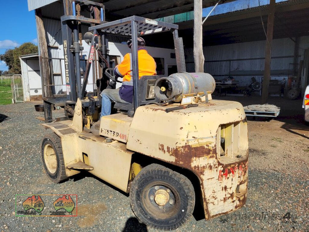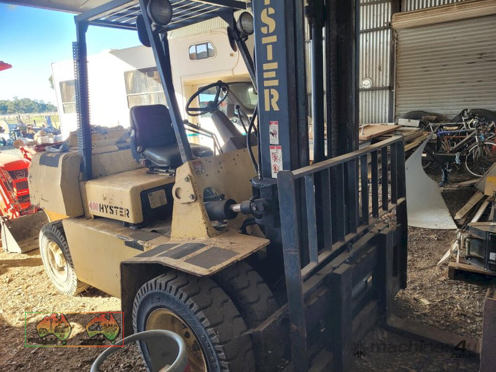 4 Ton Hyster Fork Lift (Model H 4.00 XLS-6) ~ Chevy V6 engine, on gas ~ 6,860 Hrs ~ 3.7m Lift ~ Side shift ~ Solid yard tyres ~ Duals on drive wheels ~ Good working cond. (See video)