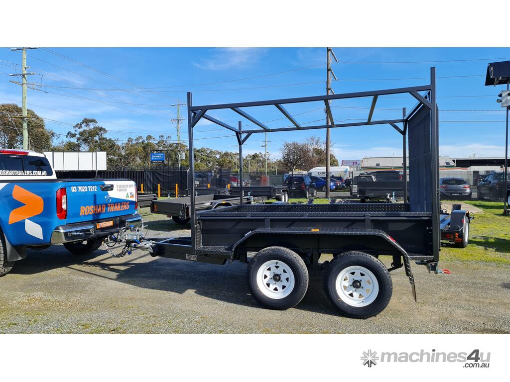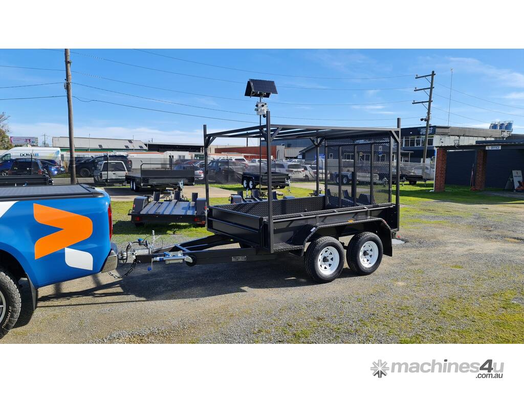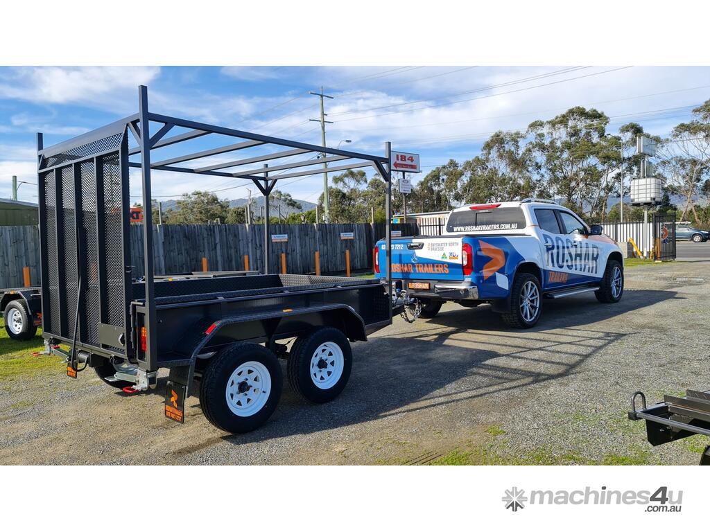 8x5 Tandem trailer 2 ton gvm Checker plate floor Checker plate sides 380 mm high Checker plate guards, steps and Front tailgate Mesh Ramp at the back with coil spring - 1500 mm high from trailer floor Side tie rails Racks on top with 4 x cross members