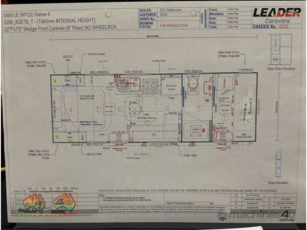 2022 Leader Caravan 22ft 7" ~ Near new condition, gas cooker & oven never used ~ 2 door version, rear access to double bunk bedroom ~ Central 2 way bathroom with shower & toilet ~ Front door access to Master bedroom & living area, with gas cooker & oven, sink, fridge, microwave, washing machine, elec. HWS, etc. ~ Airconditioned comfort, complimented with outside awning. ~ Inside height 1.98m ~ Total width 7ft 5" ~ Dual axles with roller rocker suspension & 12" electric brakes. ~ Cost was over $87k in 2022 ~ Current Vic Rego 41184A (30-Nov-2025) VIN: 6PWCARVANNC000352. ~ Fantastic van, will suit NEW BUYER ~ Hardly been used, parked in one location for occasional owner overnight use ~ Presents as NEW (NB: This Van is on the PPSR register & the Seller will discharge all debts prior to collection).