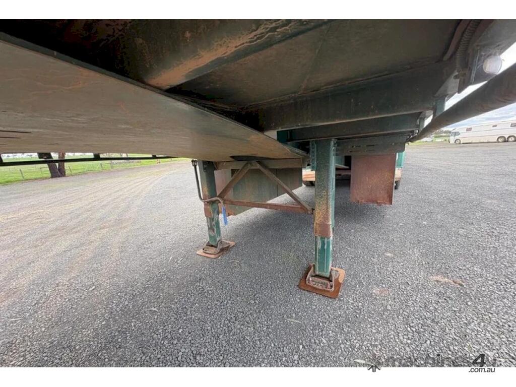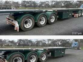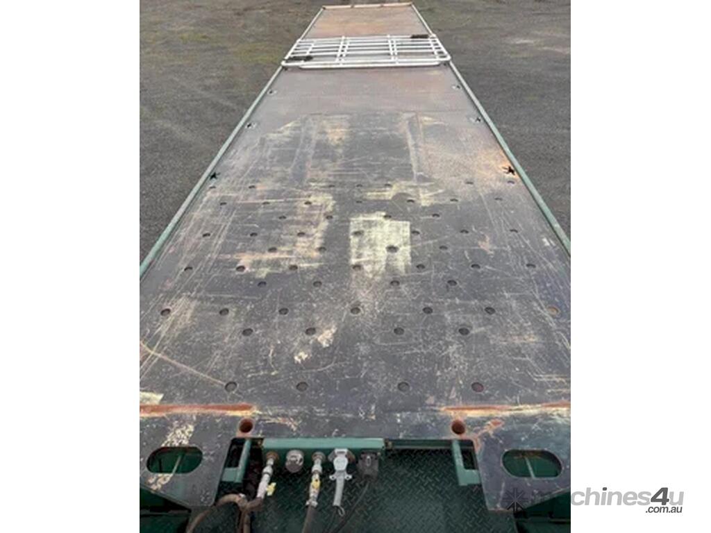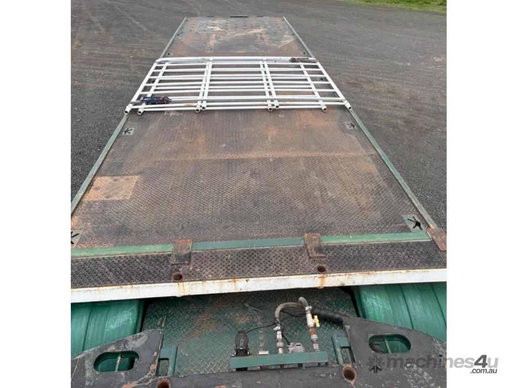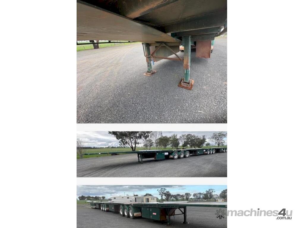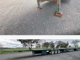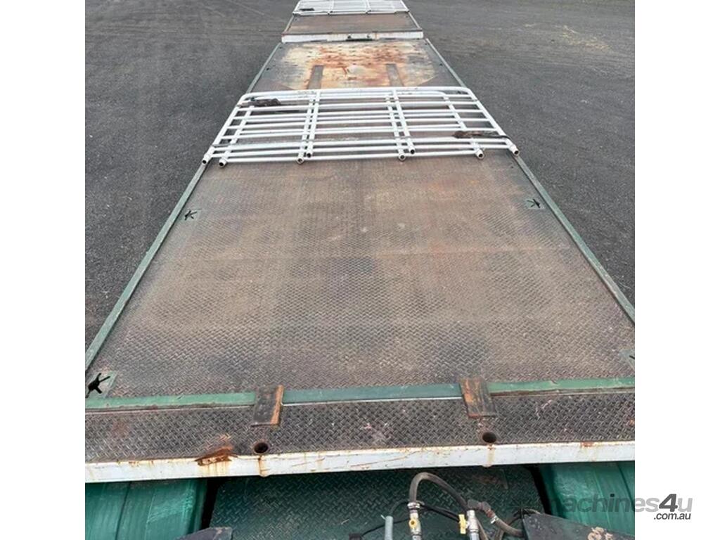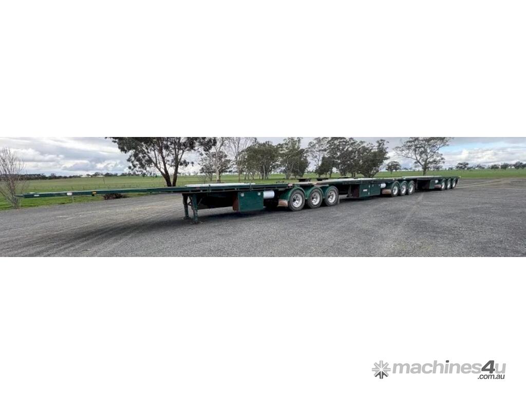 2019 Barker B Triple Flat Deck Combo ~ Texan neck flat deck set ~ 14/14/22 pallet combination ~ BPW AL axles ~ Suspension D36 air bags ~ Alcoa ultra 1 rims ~ Bridgestone 168 tyres ~ Jumbo toolboxes ~ New front/rear hurdles ~ Water tanks ~ Jost legs & greaseless turntables ~ Ring feeder in rear trailer ~ Fully welded floors with multiple chain points ~ Extra floor under runners ~ 250mm removable deck extensions ~ Dual position king pins ~ Dual electric connections ~ Raise/lower valves ~ Right way scales on all trailers ~ 21 tonne combined tare weight ~ 59 tonne combined payload. ~ 35 metre overall behind a 4.4 m wheelbase prime mover (with kingpins in front position add 720 mm - With 250 mm extensions added).