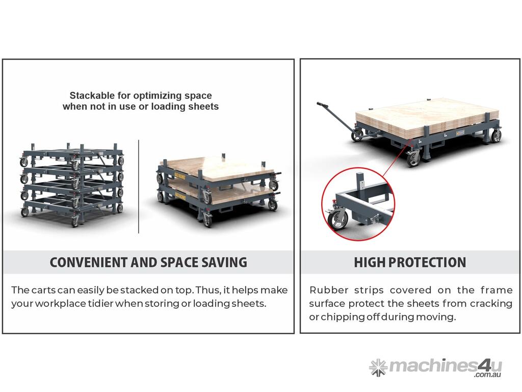 • Smart design can be stackable for optimizing space when not in use or loading slabs.