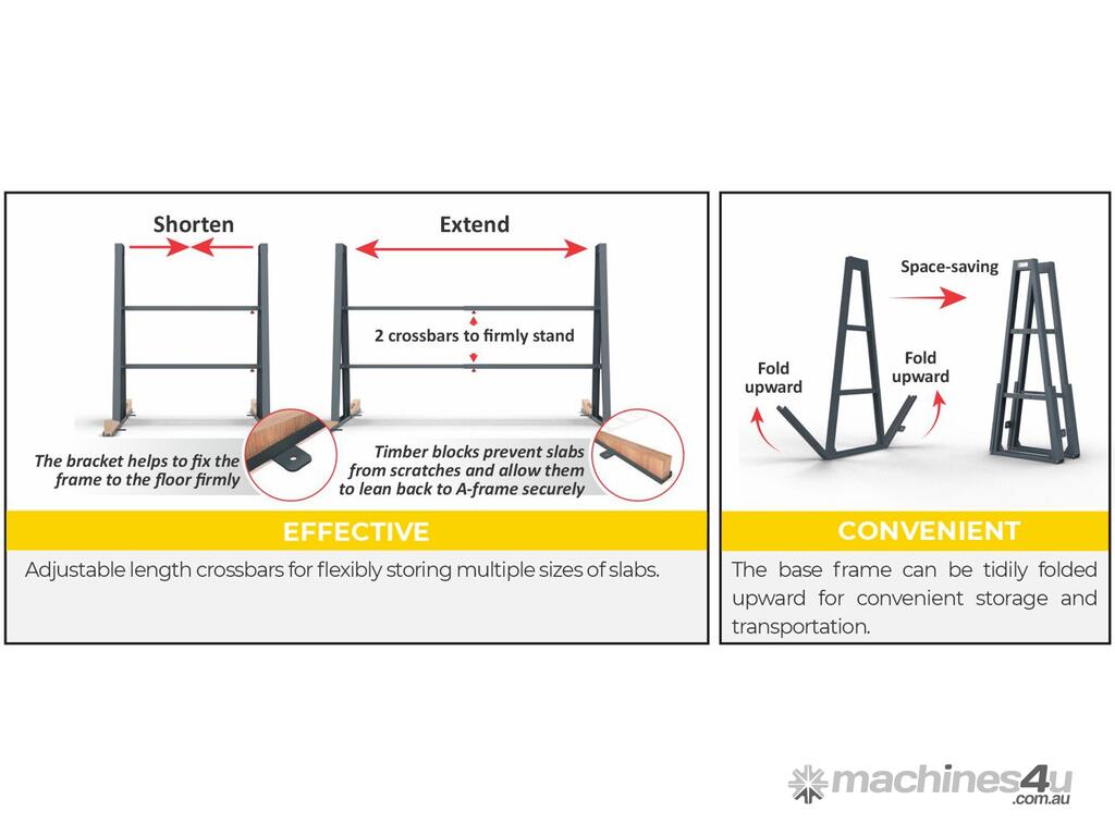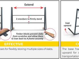 The efficient and advanced dimensions of Folding A-Frames are ideal for working well and secure with many large stone slab sizes.