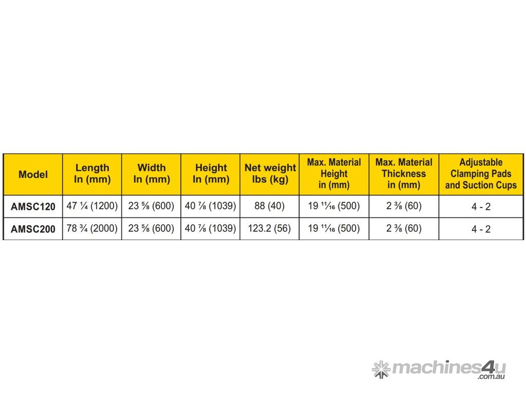 AMSC120 and AMSC200 are models in the Miter Clamp series. This collection addresses consumer concerns and offers solutions for dealing with material slabs in the stone and glass production industries.