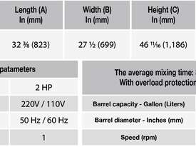 • The mixing barrel has a simple drum shape to maximize available volume and reduce the working space occupied by the machine.