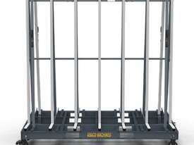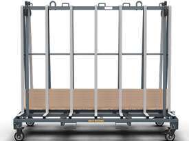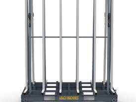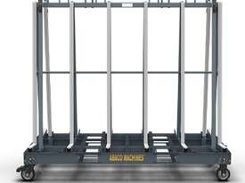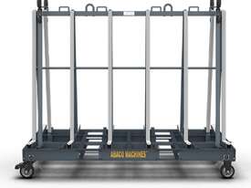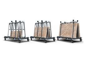 Ideal A-frame for stone and glass slab transportation in any workplace. Plenty of rubber strips and four ratchet security bars to help keep slabs steady and safe. Usable space inside standing parts of the frame to store tools and accessories. It has 4 casters for easy moving, two with brakes to lock the frame steady to the ground when needed. Casters can be replaced by quick mounting/release pins, dramatically increasing the work load limit. A-Frame has base slots and upper bar eyelets to lift with a forklift truck or an overhead crane.