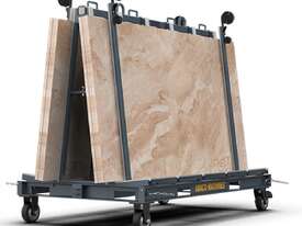 Ideal A-frame for stone and glass slab transportation in any workplace. Plenty of rubber strips and four ratchet security bars to help keep slabs steady and safe. Usable space inside standing parts of the frame to store tools and accessories. It has 4 casters for easy moving, two with brakes to lock the frame steady to the ground when needed. Casters can be replaced by quick mounting/release pins, dramatically increasing the work load limit. A-Frame has base slots and upper bar eyelets to lift with a forklift truck or an overhead crane.