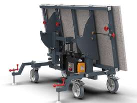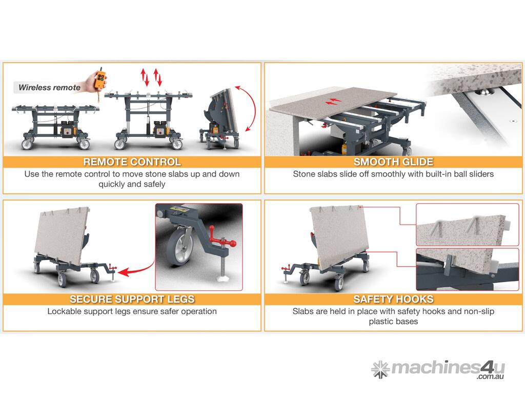 • Rubber strips, safe stop brackets and locking handles protect the slab surface during transport.