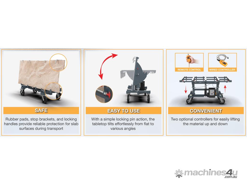 • Rubber strips, safe stop brackets, and locking handles are ideal for protecting the slab surface during transport.