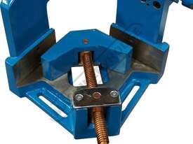 This rugged cast iron mitre clamps is just the job for heavy duty clamping metal sections for prep welding. The jaws are pivoted on the end of the copper coated screw that allows for a large degree of misalignment when clamping work pieces of different thickness. They can be used for mitre or T joints and with equal or odd material thicknesses. All the clamping surfaces, including the bases, are machined at 90°.
