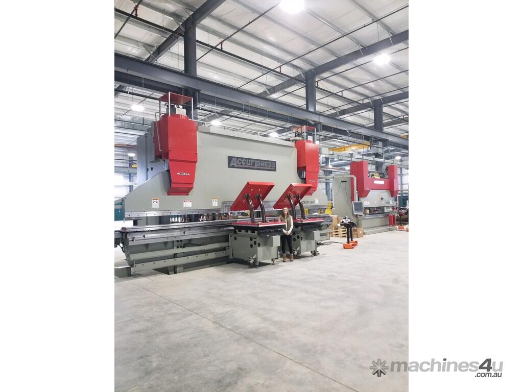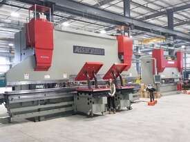 Accurpress Medium Tonnage Press Brakes have capacities of 320 tonnes – 800 tonnes, are rugged and designed for pressing plate. They have stronger tool clamps, very solid frames and heavy-duty slides. Stroke length, open height, length, table size and force per metre can be designed to suit any application. The standard approach and retract speeds are equivalent or higher than any other machines in the market and can optionally be increased to suit customer requirements. Additionally, stroke length and open height can be increased if necessary.