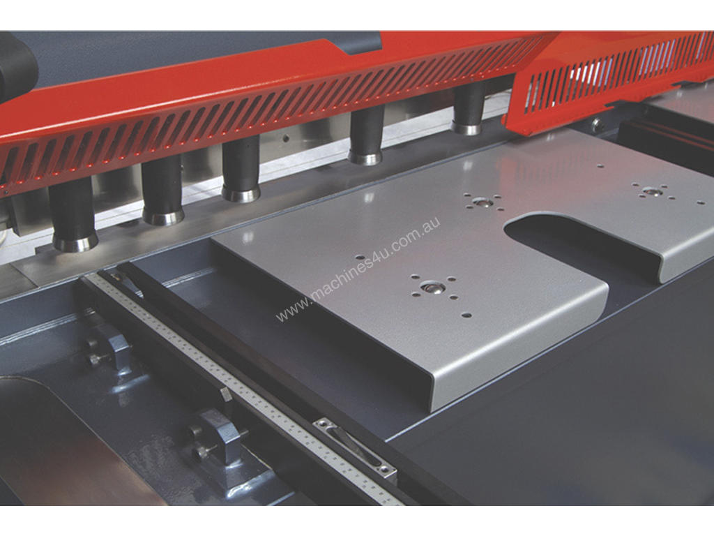 VS Series CNC Guillotines provide versatility along with the technology and construction for shearing thin narrow strips or the precision processing of large plates. The upper beam which carries the upper blade is guided by adjustable preloaded and hardened guide ways, a system normally found in much more expensive machines. Both the rake angle and the blade clearance are adjusted hydraulically reducing maintenance and providing overload protection.