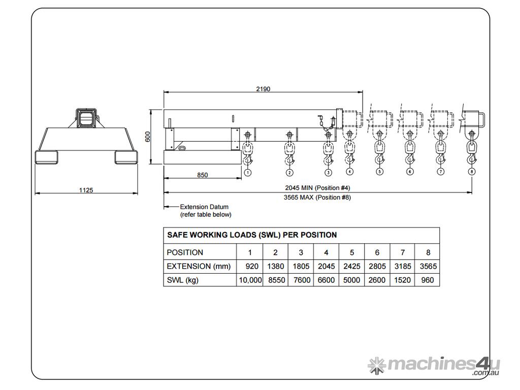 The type SFJL10 Fixed Jib (Long) is designed as an affordable general purpose Jib with a 3.56 metre reach when fully extended. This Jib has been designed with wide pockets suitable for Forklifts with special hydraulic Tine Positioners. This slip-on Forklift attachment is held to the Forklift by a safety chain. The Jibs overall length when closed is 2.19 metres. Supplied with safety swivel Hook and Shackle.