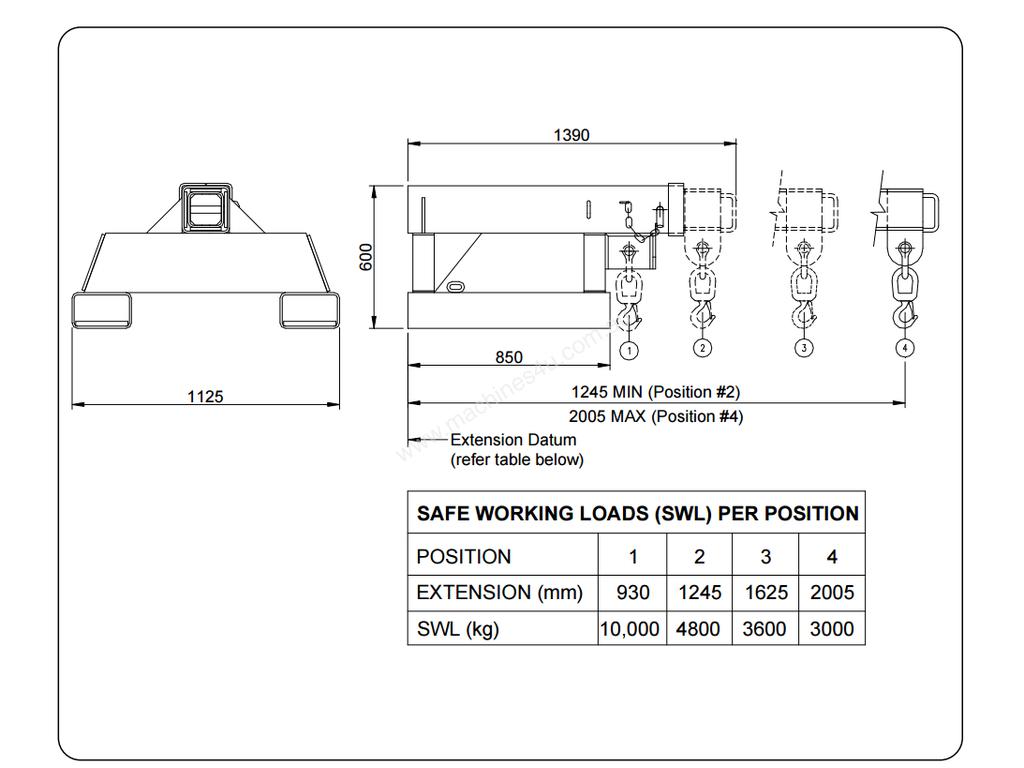 The type SFJS10 Fixed Jib (Short) is designed as an affordable general purpose Jib with a 2.0 metre reach when fully extended. This Jib has been designed with wide pockets suitable for Forklifts with special hydraulic Tine Positioners. This slip-on Forklift attachment is held to the Forklift by a safety chain. The Jibs overall length when closed is 1.39 metres. Supplied with safety swivel Hook and Shackle.